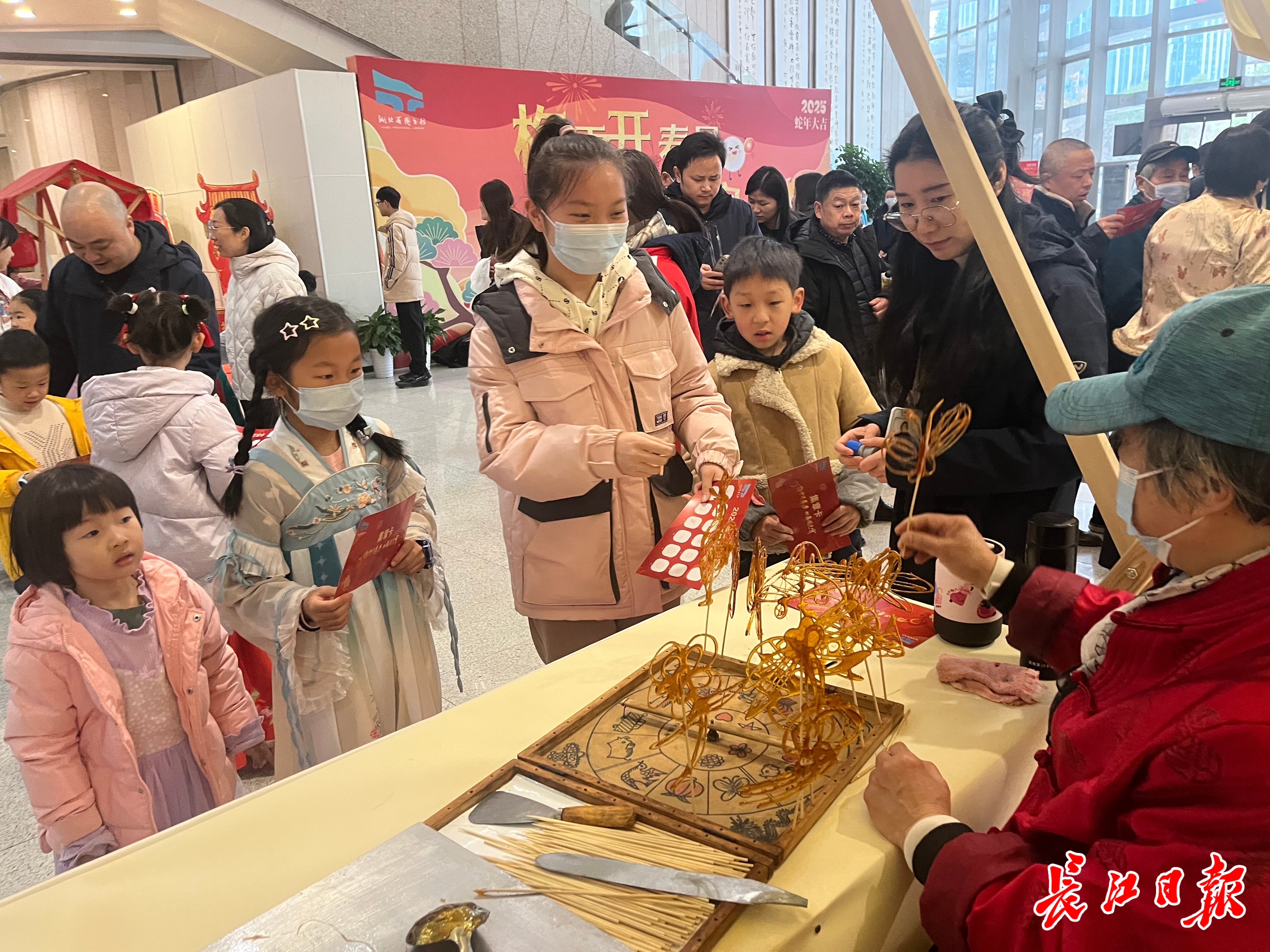 当日上午,记者在省图一楼东大厅看到,糖画艺人的铜勺流转间勾勒出呆萌可爱的蛇形糖画,小读者开心地拿着蛇形糖画,露出灿烂的笑脸;图书馆馆员与读者穿着传统服饰共同参与投壶射礼、灯谜挑战等活动,其乐融融。