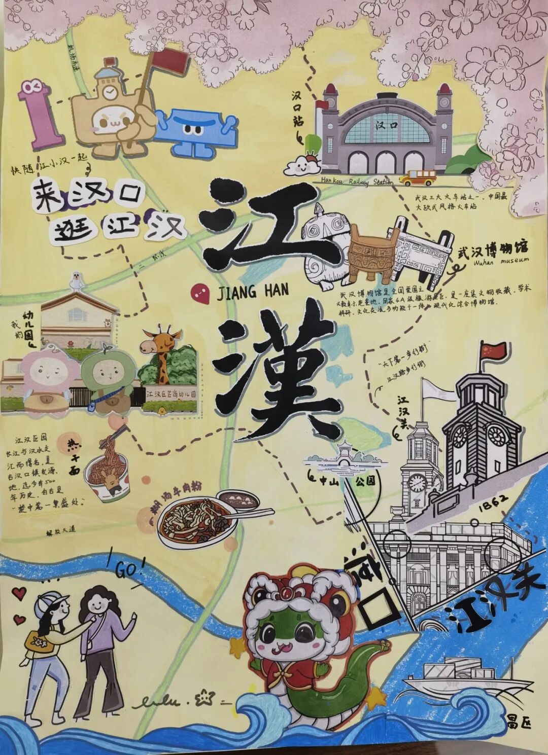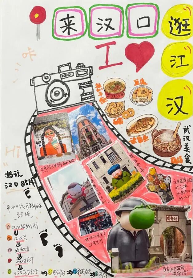 瞧,这副手账宛如灵动的画卷,以细腻笔触绘出江汉标志性建筑与景点。美食、美景跃然纸上,“江小汉”“江汉关”“中山公园”等江汉经典形象元素满溢文化韵味,像是一封邀请函,待君共赏江汉之美。