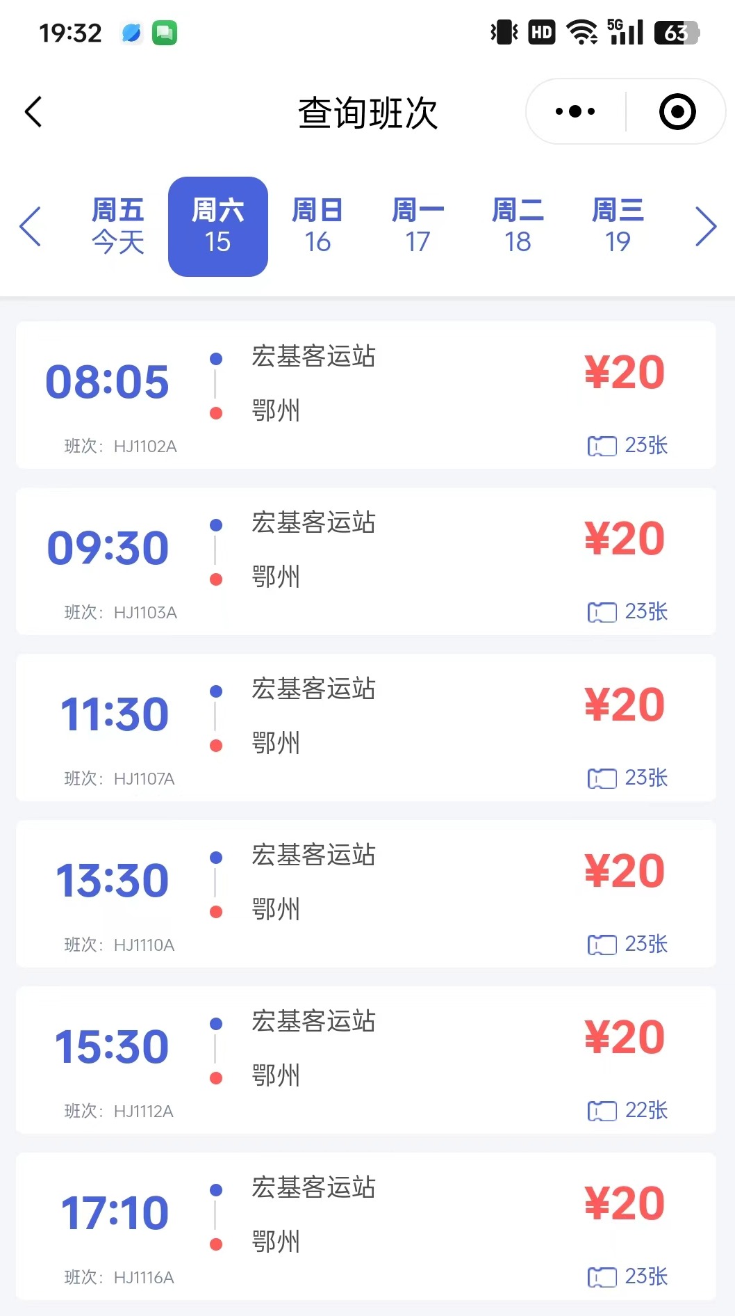 “96513”购票小程序显示,宏基客运站至鄂州票价为20元/人。