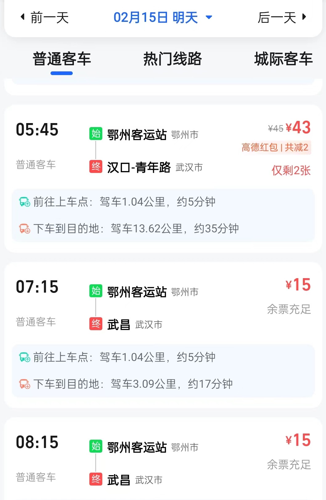随后,记者通过高德地图软件的客车购票链接查询,鄂州客运站至武昌的普通客车票价的确为15元,且余票充足。而宏基汽车客运站至鄂州客运站的价格则为28元/人。