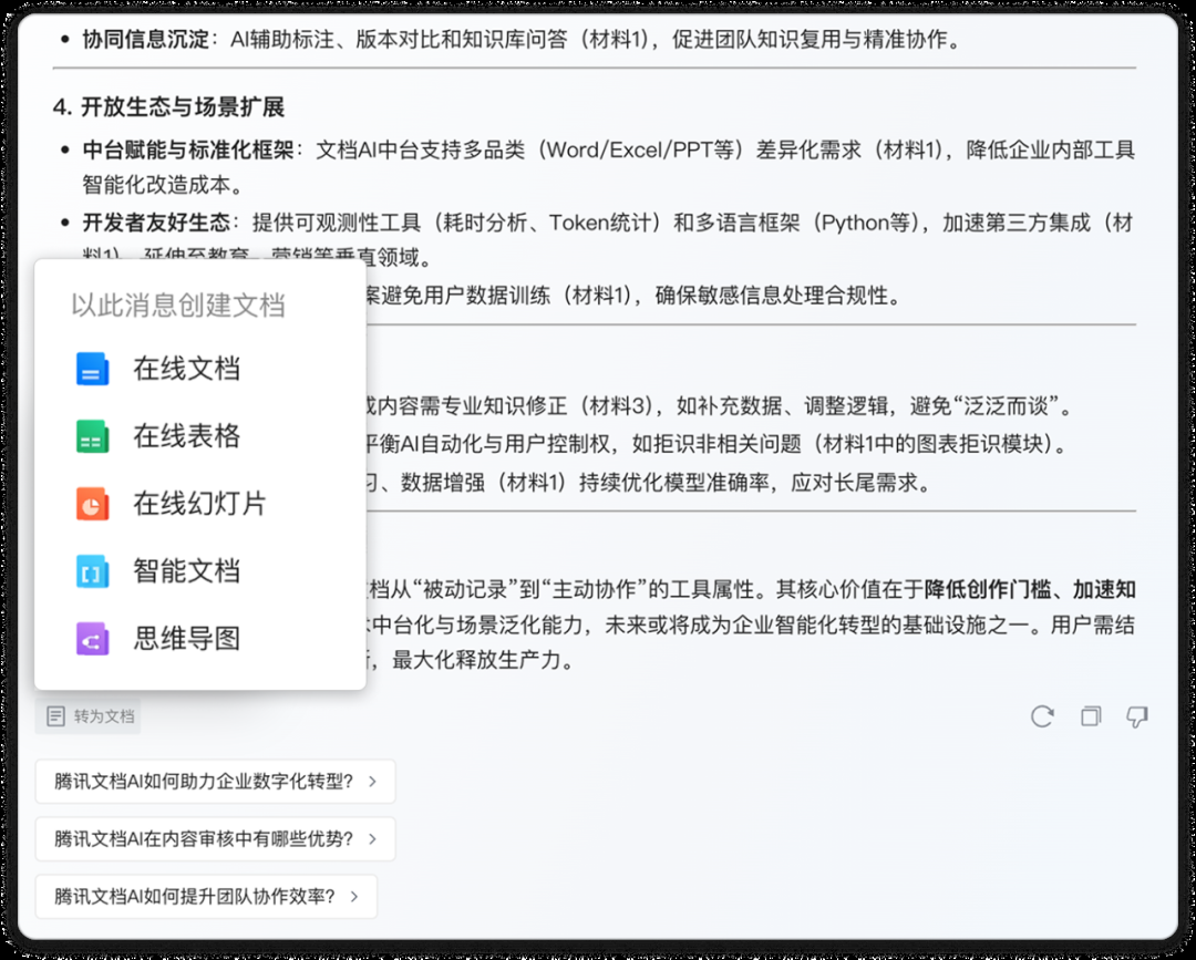 官方表示,AI文档助手专业创作能力与DeepSeek结合,为用户提供更实用的文档总结、文档问答和摘要大纲等能力,模型生成的结果可直接生成文档、表格、幻灯片、思维导图、智能文档。