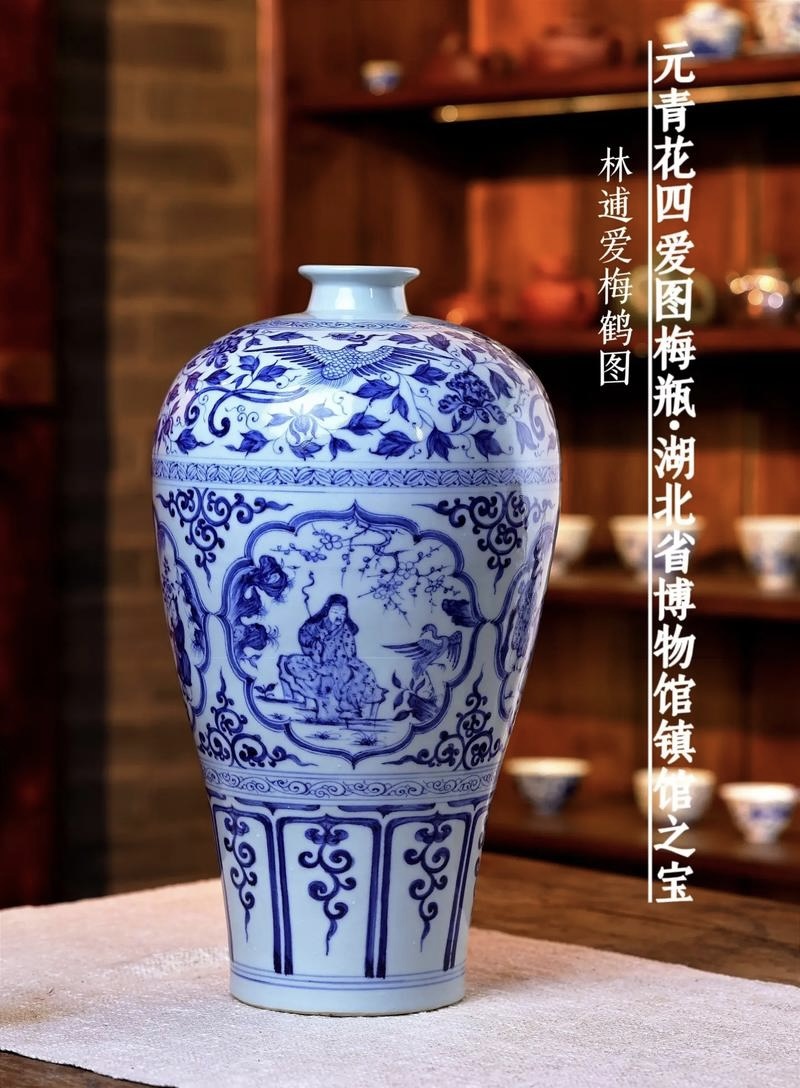 在湖北省博物馆和武汉博物馆,分别收藏有一个元青花四爱图梅瓶,都是珍贵的镇馆之宝,瓶身上青釉画呈现四幅图,分别画着四个历史文人逸事:王羲之爱兰,陶渊明爱菊,林和靖爱梅鹤,周敦颐爱莲。