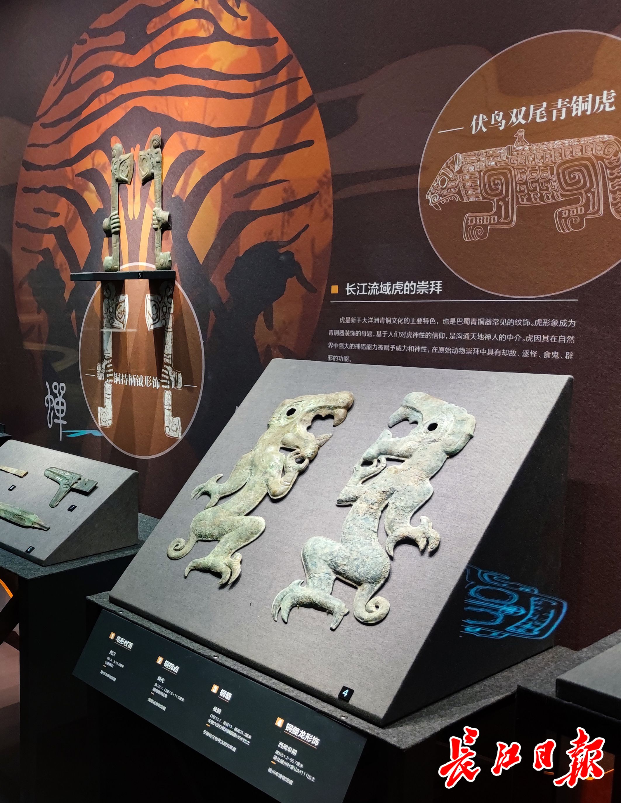 展览根据商周时期长江流域文化特征,划分为“既田疾兵”“设宴飨客”“异彩华章”三个单元,以及精品文物展区“物华天宝”。代表展出文物有四川三星堆遗址铜人像、湖北随州叶家山墓地编钟、湖北荆州菱格纹铜剑、江西新干大洋洲商墓铜方鼎、湖南株洲铜鸮卣等文物精品,百余件青铜器精品共同表现了长江流域高度发达的青铜文明与独特的艺术审美。