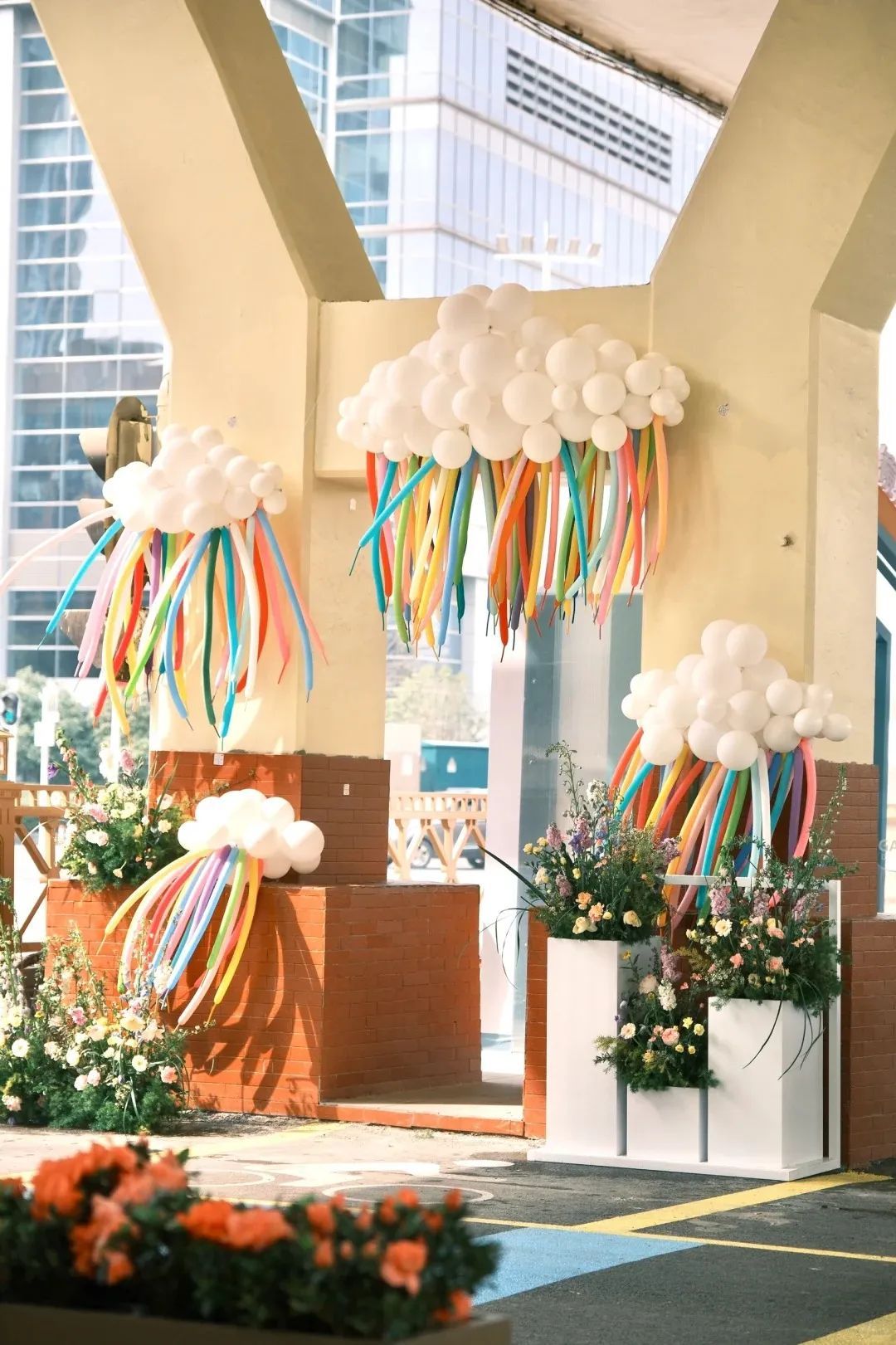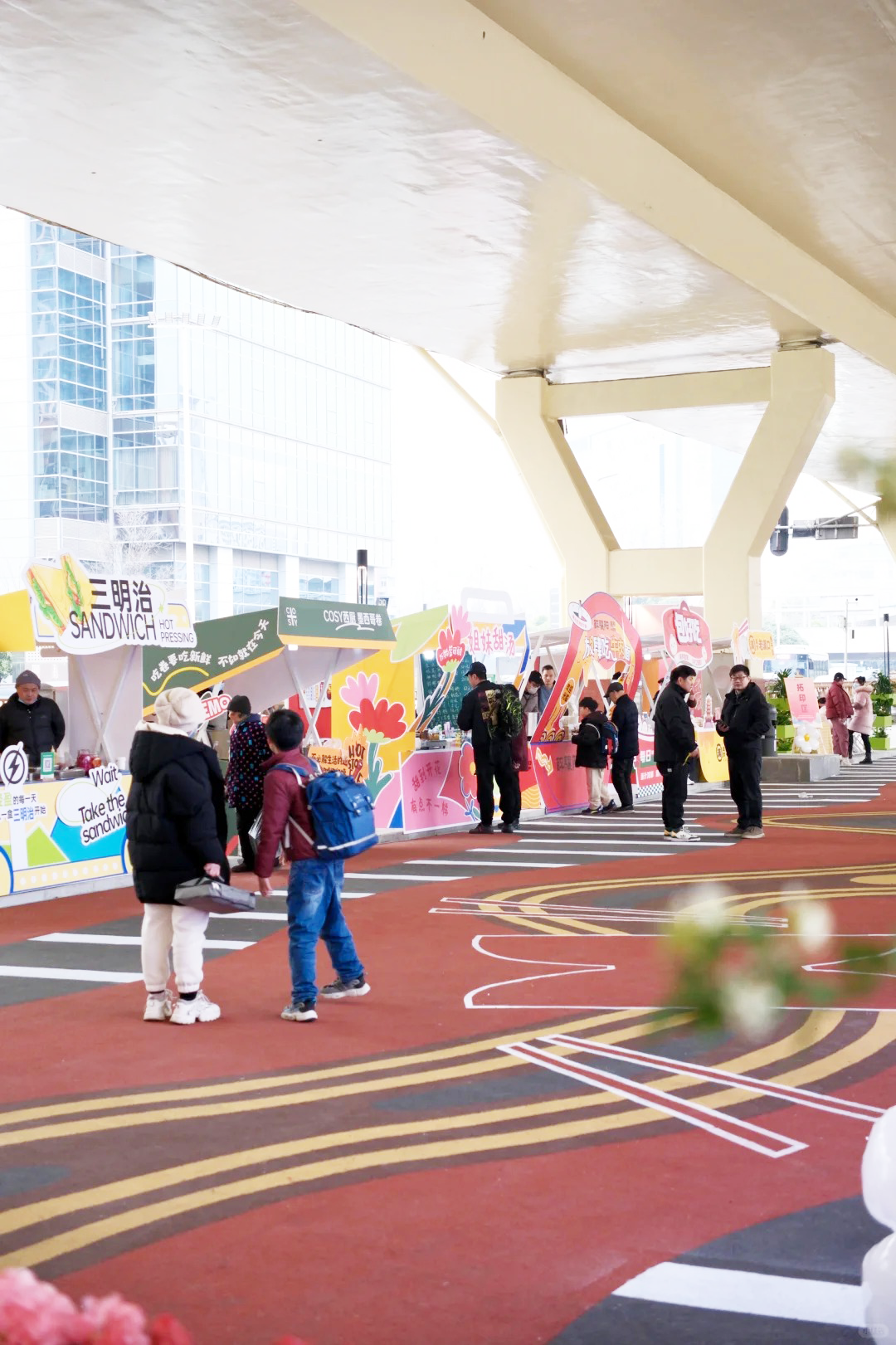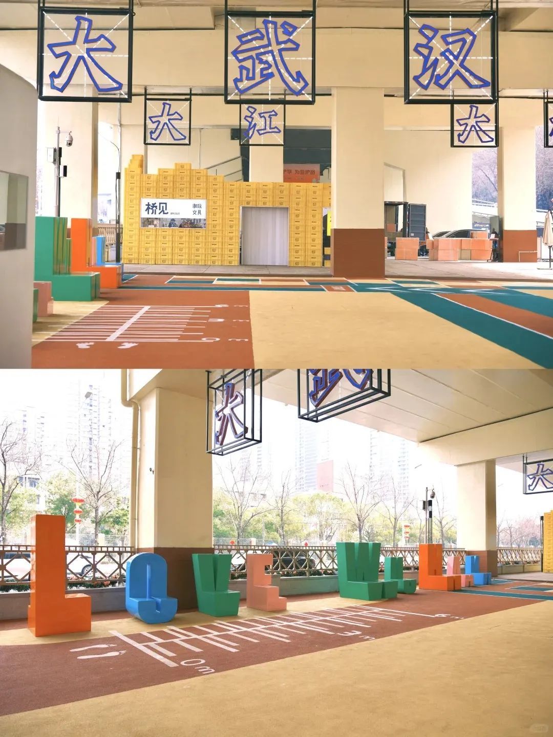 现在桥梁底部和立柱告别冰冷的青灰色,漆上了明黄色涂料,地面铺上了红、黄、绿相间的防滑透水步道,穿插热干面波形图案、竞速赛道等元素,显得热烈活泼。