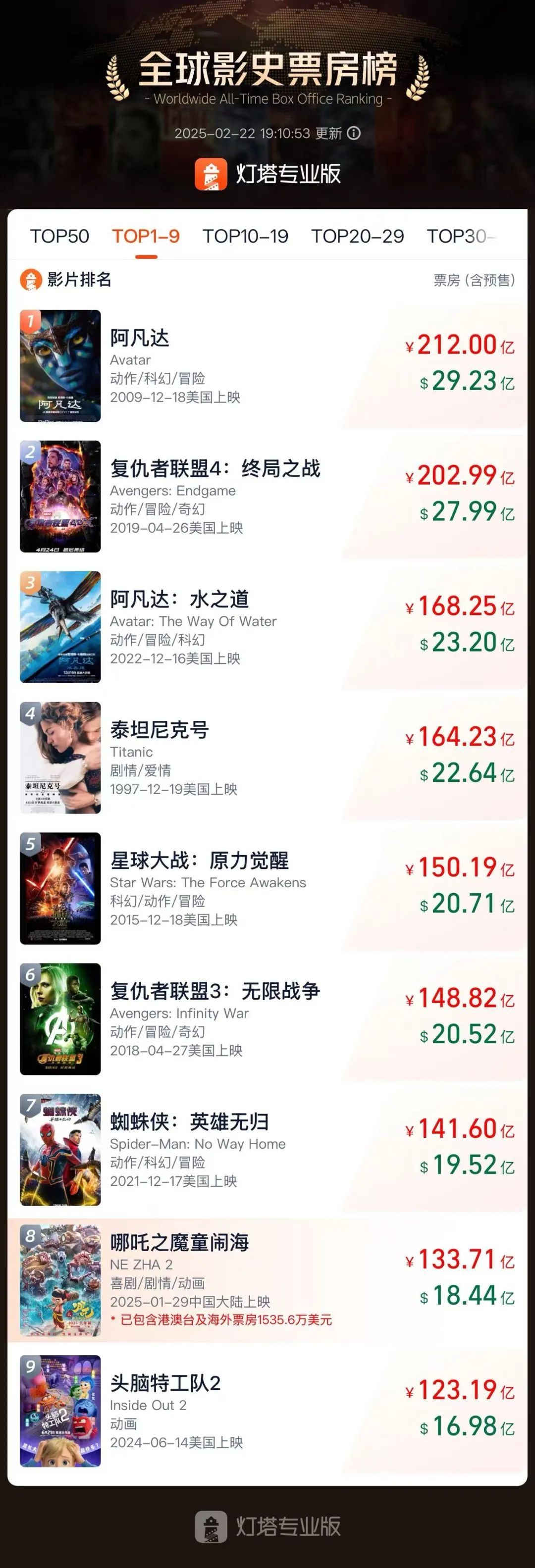 暂列全球票房榜第8位