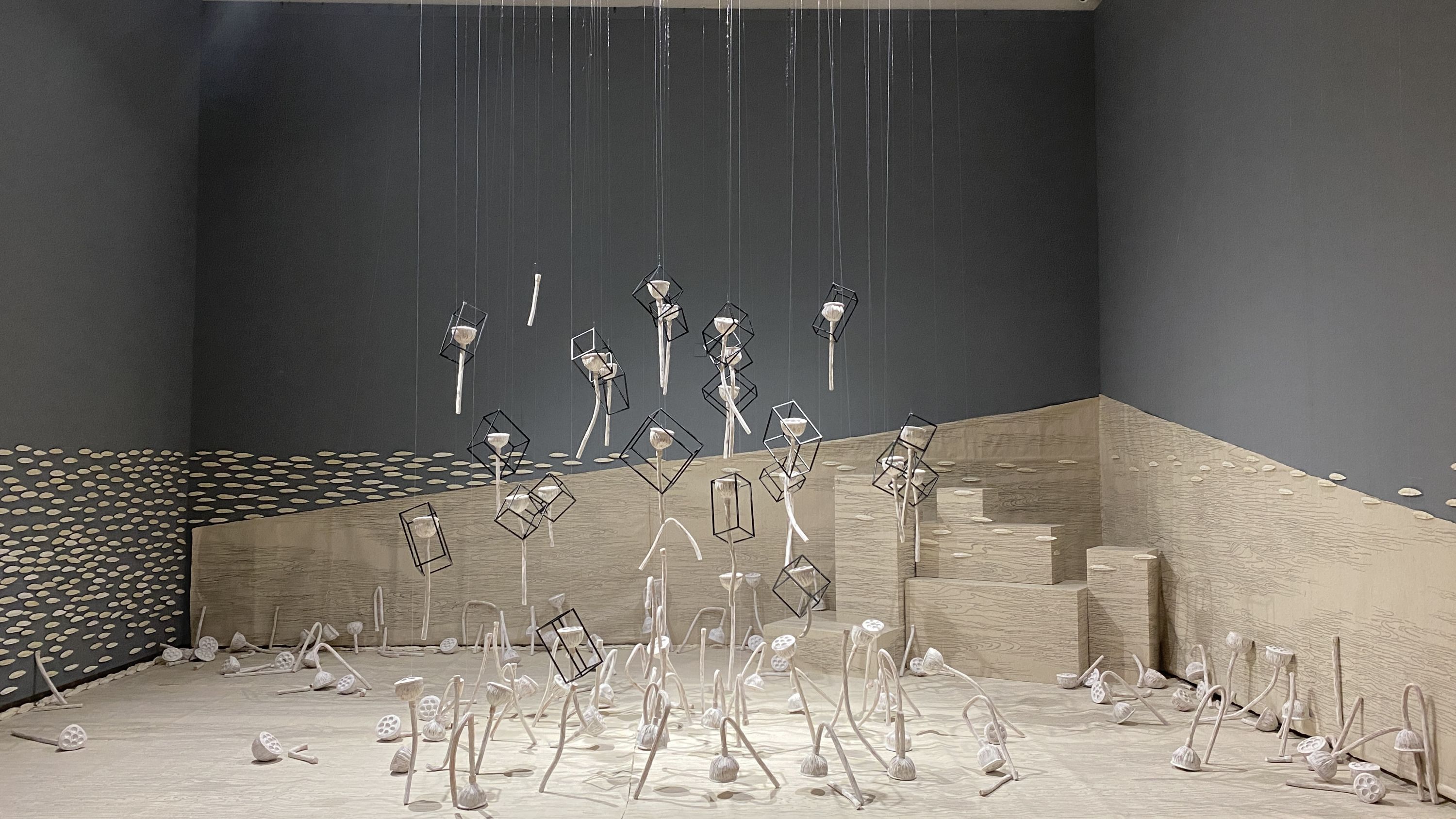 从展出的艺术作品来看,徐武斌教授吸纳西方现代抽象的思维方式,从文化记忆出发连接自然万物,观物取象。《曼舞》《细雨》等作品从自然中汲取灵感,运用交织重叠的色彩和奔放洒脱的线条表达对生命的感悟。深耕于陶瓷领域的邱玲教授用温润的泥土去聆听内心的世界,以女性化的视角诠释了生命繁衍的内涵,《花之灵》《莲之魂》等系列的造型符号均从植物中汲取提炼。徐薇子于艺术家庭的熏陶中成长,也生长在自由多元的跨文化语境之中,她创作的《孤岛》系列以实验性的方式诠释着叙事的想像力,运用夸张、变形、抽象等表现主义手法来反观内心世界。