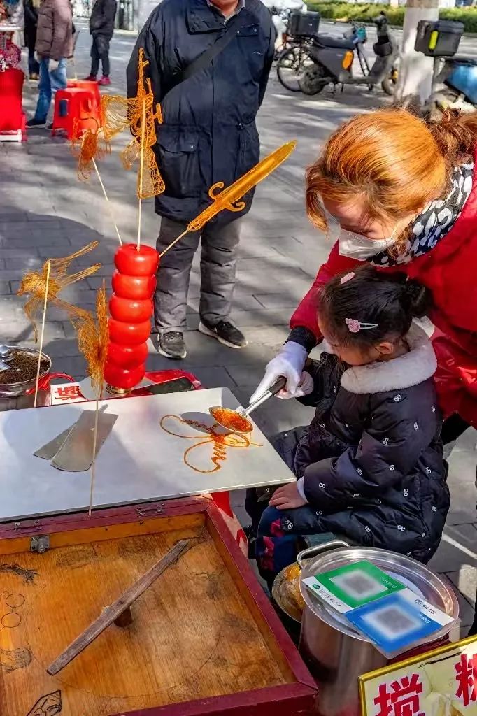 集市上的各种手工非遗作品,吸引着来往的游客,吹糖、搅糖等各种传统技艺让人梦回童年。
