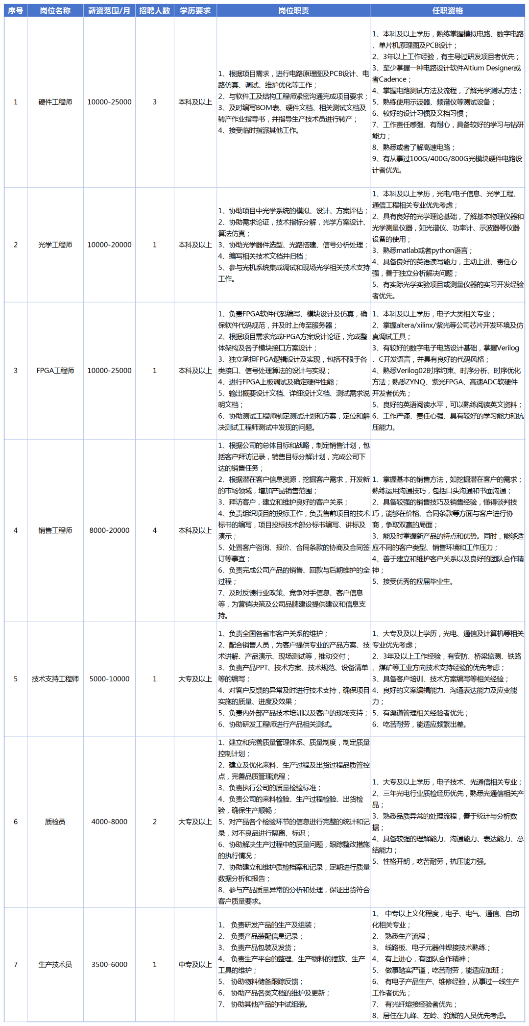 1、年龄25-40岁,初中及以上学历,有制造业、光通讯行业经验者优先。