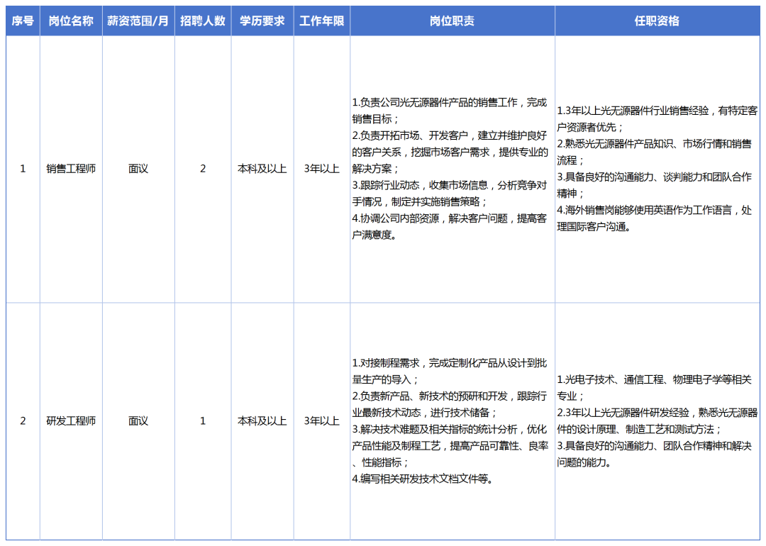 1、年龄30-40岁,统招本科及以上学历,光通讯相关相关专业,条件优秀者可适当放宽。