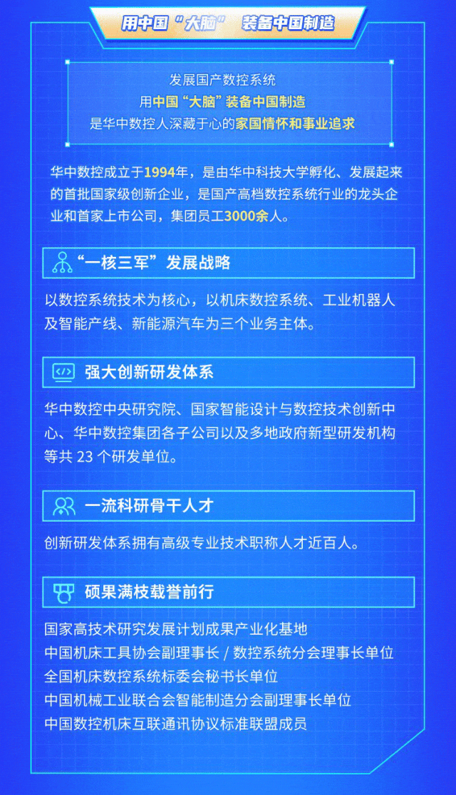 华中数控是由华中科技大学孵化、发展起来的首批国家级创新企业,是国产高档数控系统行业的龙头企业和首家上市公司。以数控系统技术为核心,以机床数控系统、工业机器人及智能产线、新能源汽车为三个业务主体。