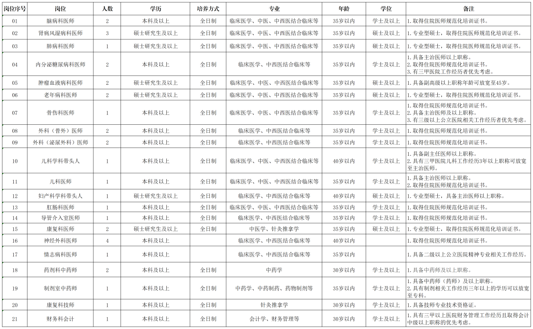 医师岗20人、技师岗6人、药师岗2人、护理岗9人、职能科室岗2人。