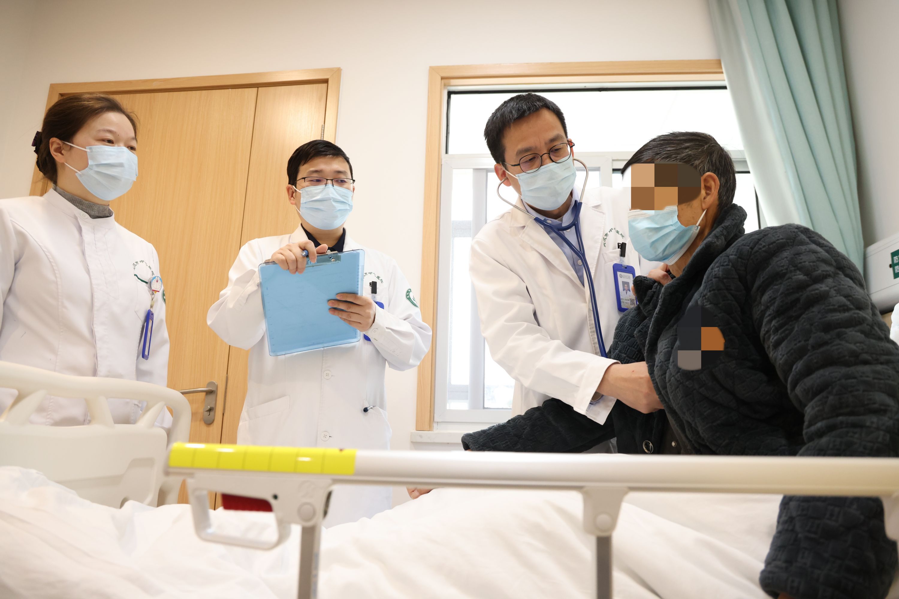 呼吸与危重症医学科主任医师倪吉祥(右二)查看患者恢复情况。