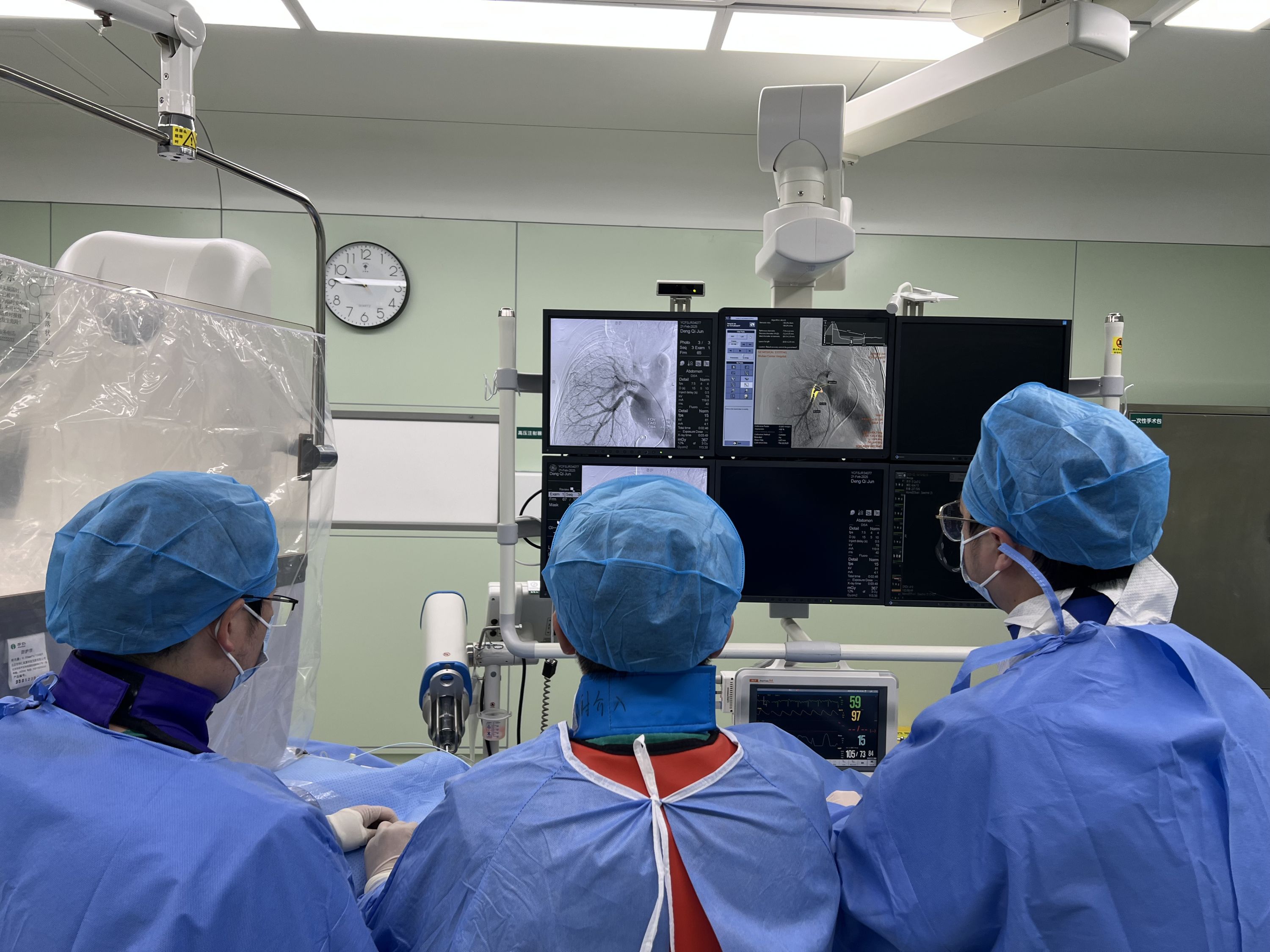 该院房颤专病中心负责人、心血管内科副主任医师叶平和郭鑫医生顺利完成了从右心房到左心房的通道建立——房间隔穿刺。随后,呼吸与危重症医学科血管介入专业组副主任医师夏冬平和主治医师李培凌通过房间隔穿刺鞘,顺利植入支架,撑开了狭窄的肺静脉血管。