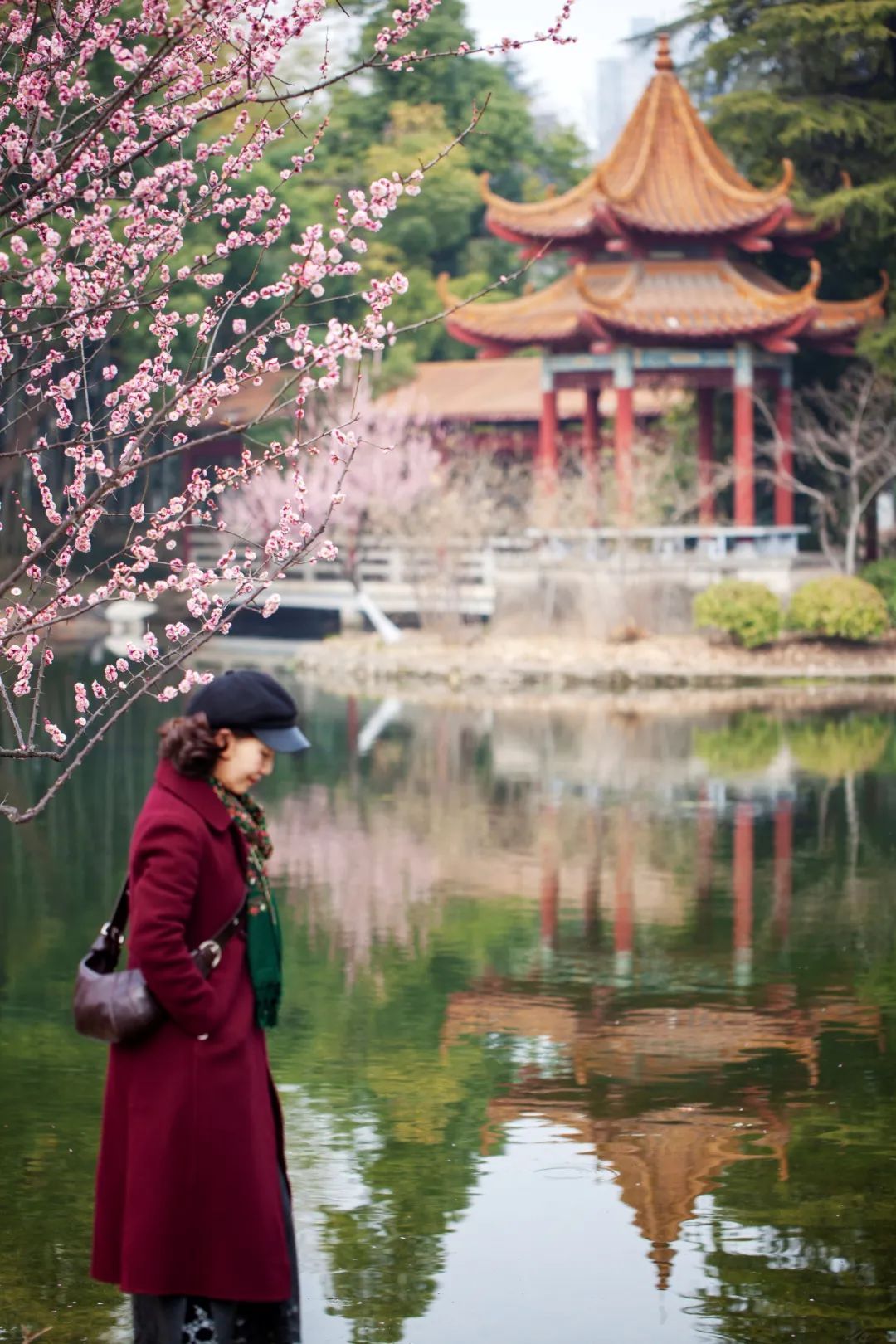 青山公园里,一位女士红衣倩影,驻足池塘畔,画面宁静雅致,尽显自然之美。