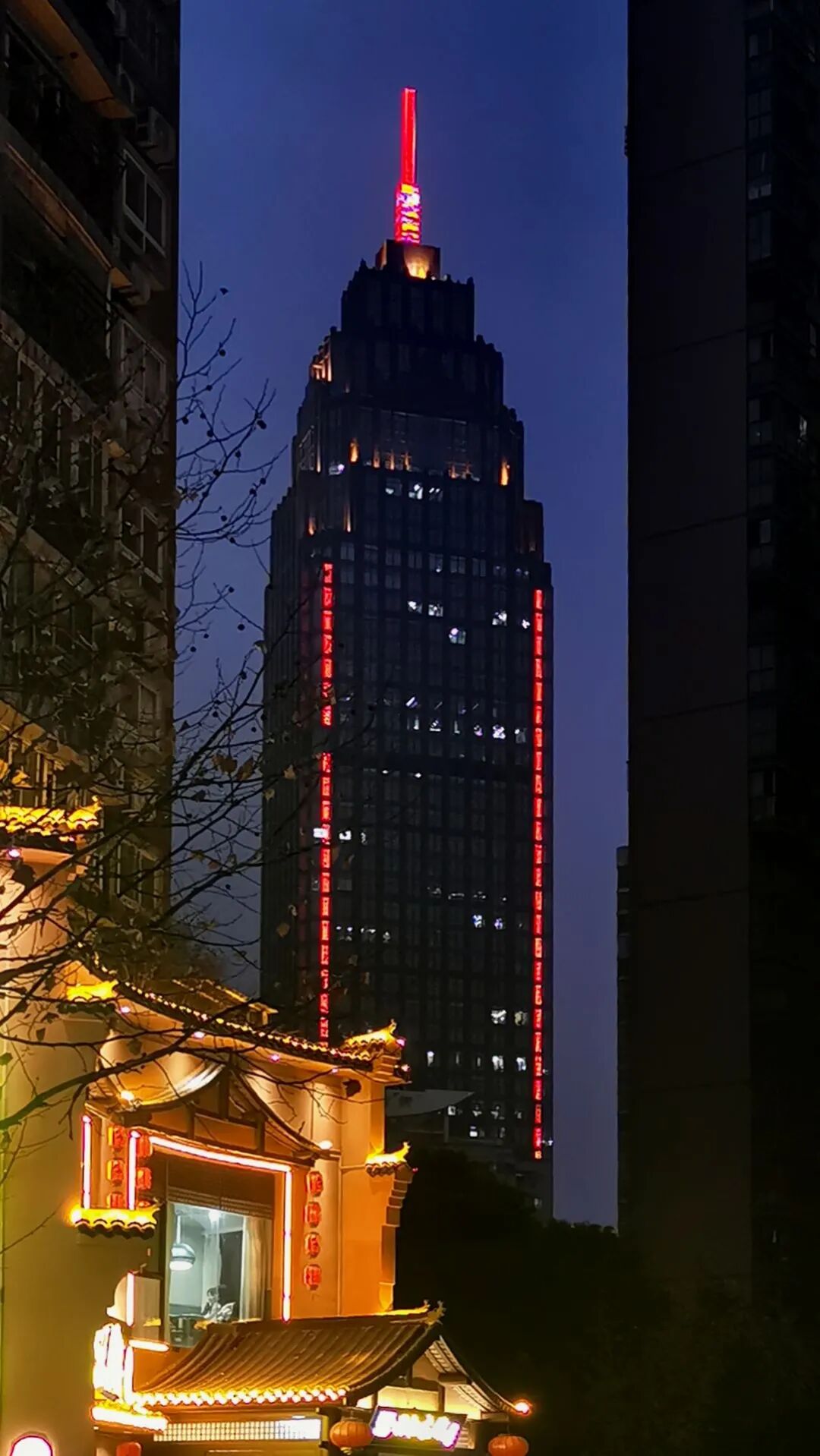 夜色渐浓,天空被染上了一抹迷人的蓝。漫步在武汉市江汉区马场角横路,眼前的高楼大厦仿佛与天际相接,灯花秀更是流光溢彩。近处,仿古建筑静静矗立,古朴典雅。古今建筑交相辉映,冷暖色调对比鲜明,构成了一幅摄人心魄的画面,令人眼前一亮。