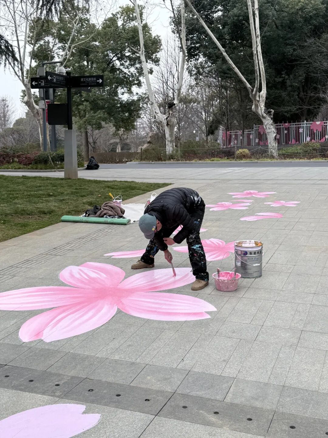 路过景区外围时,同事突然喊道:“快看!粉色的花!”我头也不抬地回答:“肯定是梅花,磨山梅园可有名了!”边说边往窗外看,咦,好像还真不是梅花。只见一位师傅蹲在路边,拿着画笔全神贯注地在水泥地上“种”樱花。我们凑近一看,地上已经有十几朵绽放的粉色小花,每片花瓣的渐变都细腻至极,层次分明。师傅全程专注,连我们在旁边拍照都没抬头。