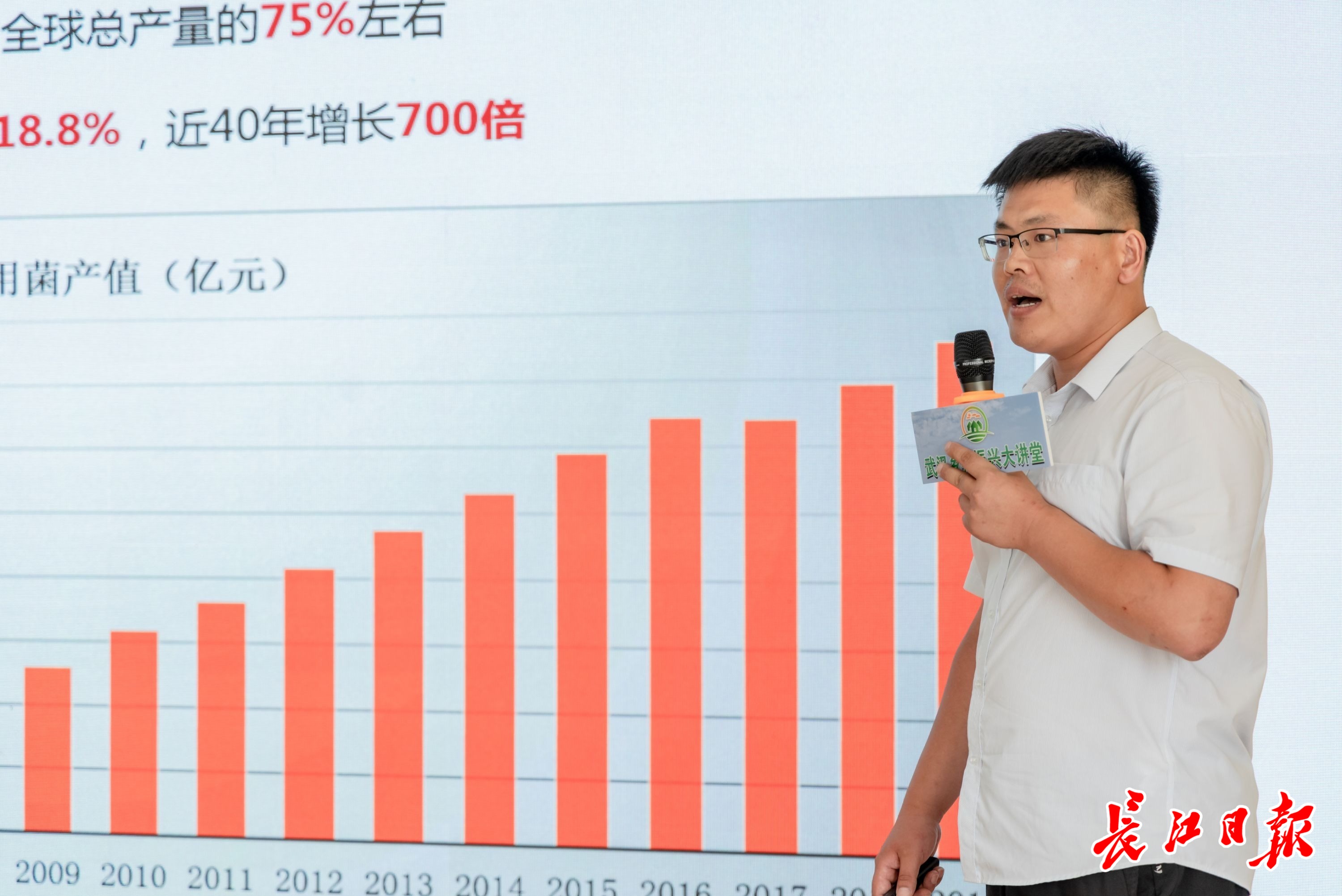 食用菌产业有“不与人争粮、不与粮争地、不与地争肥、不与农争时、不与其他作物争资源”的特点,而和其他作物相比,食用菌的生长周期短、经济效益好,堪称“大产业”。孙磊介绍,近40年来,中国食用菌年产值增长700倍,目前已超3000亿元。目前武汉市每年食用菌鲜食消耗估计达5万吨,市场规模达10亿元,整个湖北食用菌产业具有巨大的成长空间。