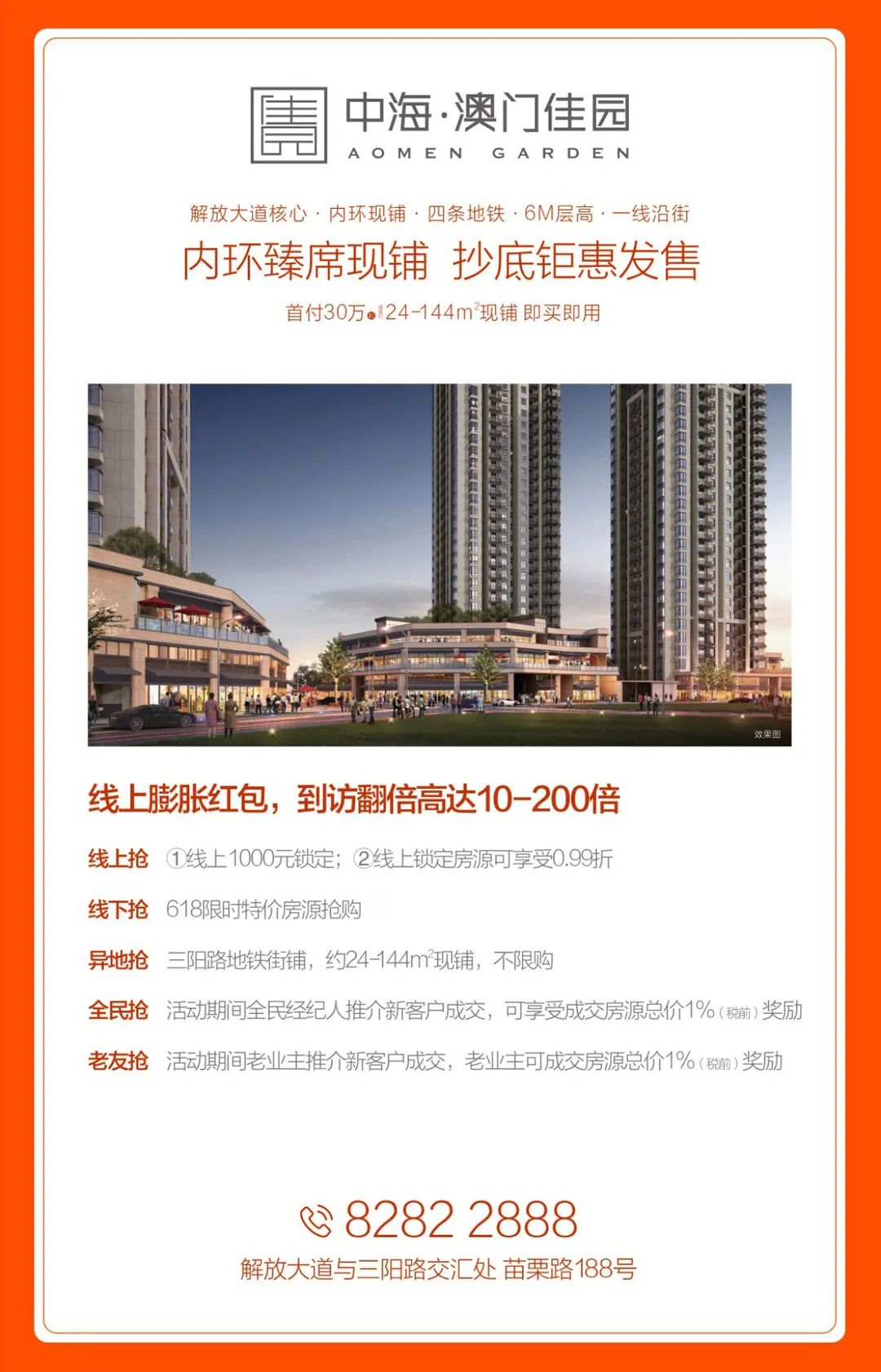 中海·澳门佳园,直面武汉核心干道——解放大道,约1公里范围,覆盖23个成熟小区,约6万常住人口,近邻约500万方写字楼,覆盖101万高端商务消费人群。四条地铁交会,首层约6米层高,拓展空间大;大面宽,昭示性强,客流更广;独创退台设计,可利用空间广,室内外经营灵活,一线沿街,不限购。