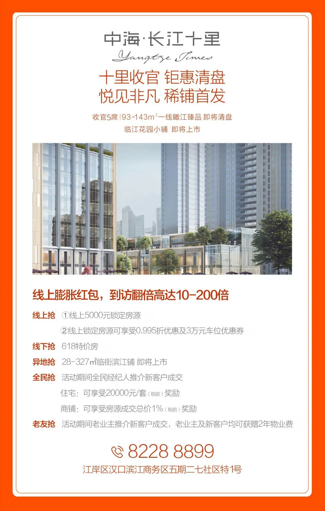 中海·长江十里,位于武汉最火热的板块之一——二七滨江板块的核心,一线临江的中海长江十里住宅基本清盘,趁热推出二七滨江核心区首个BOX+商业体中海江花泾,建面约30平方米起,层高6米,满足餐饮条件。项目辐射周边超228万方豪宅,聚集武汉高端人群,这里是未来武汉陆家嘴的中央。无论是出租还是自营,均是入手好时机。最低不到百万元总价,小投资带动无限商业想象。
