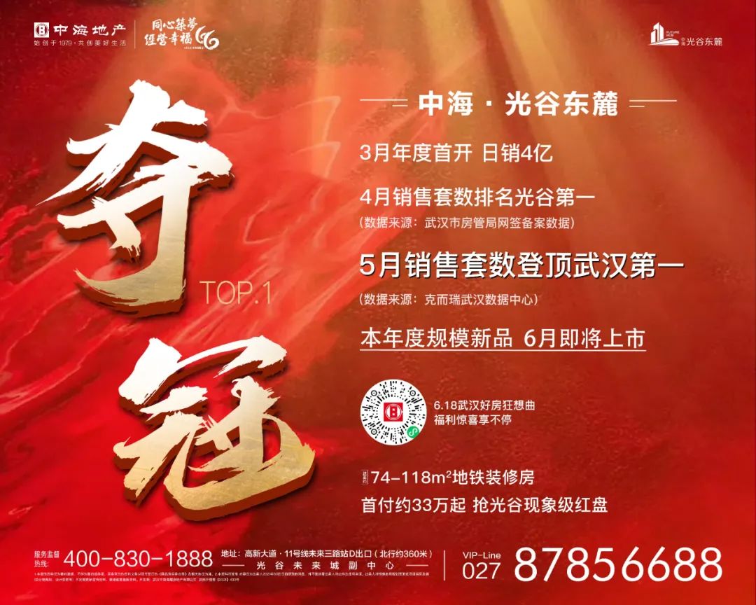 中海·光谷东麓,位于“武鄂金三角”主轴、未来城副中心,千亿级科技创新大走廊之上,离地铁11号线仅约360米。约55万方幸福社区内,娱乐、教育、生活等全方位优质配置,好品牌、好品质、好户型“三好”高标准精装房在光谷脱颖而出。5月份项目荣登武汉网签套数榜首。本年度大规模新品即将于本月入市,匠心景观配套首度亮相。