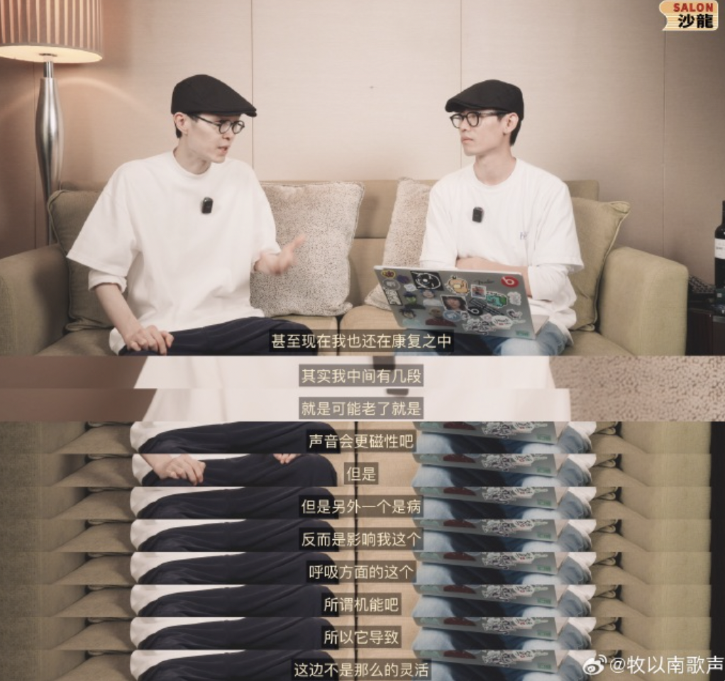 在与博主hopico的谈话节目中,方大同表示,之前一段时间消失,生病是一个主要原因。而关于声音变化,一方面原因是因为自己年龄增长,“可能是老了”,另一方面因为生病会影响呼吸方面的机能,导致声音出现变化。据港媒报道,2010年方大同因操劳过度,出现(气胸)爆肺而数度住院。