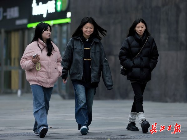 3月2日下午,汉口冷风呼啸,3名姑娘穿着冬衣有说有笑走过街头。长江日报记者胡冬冬 摄