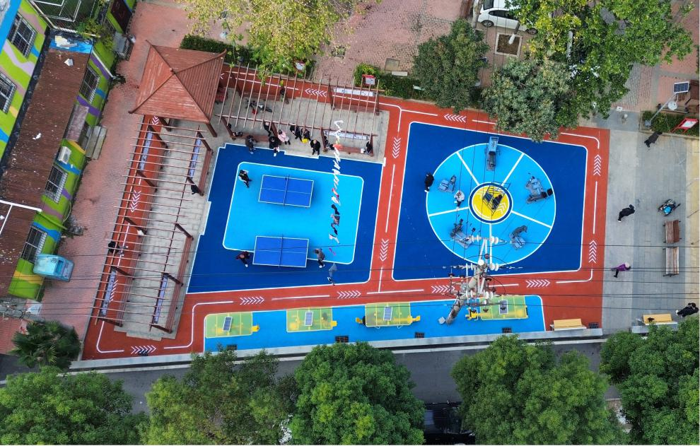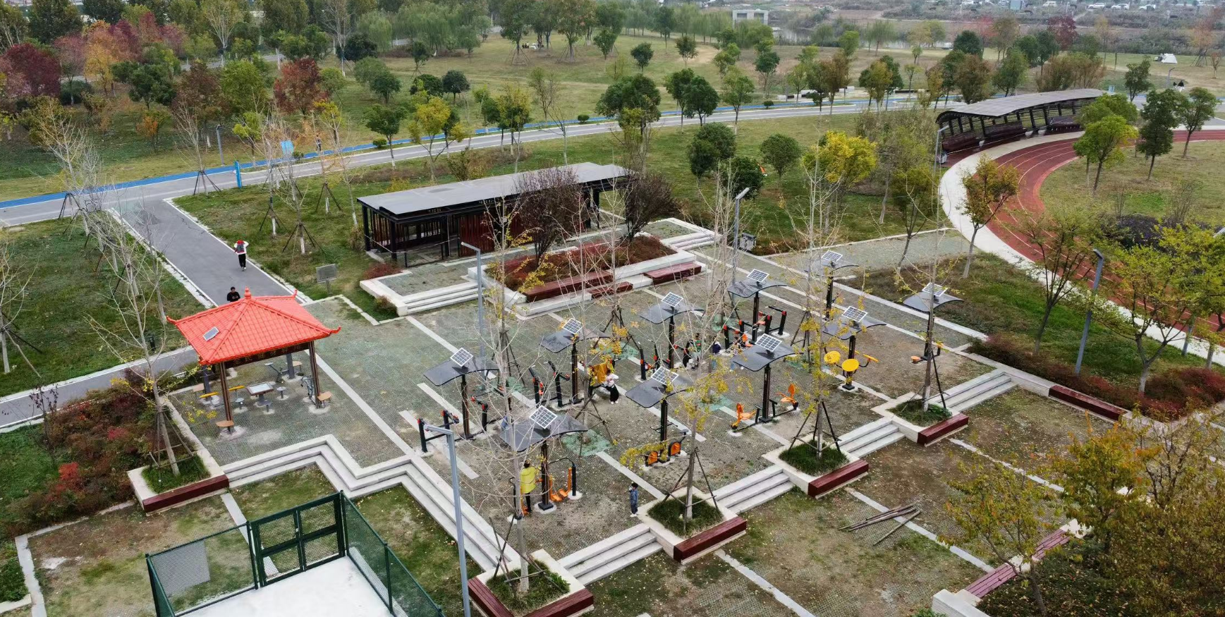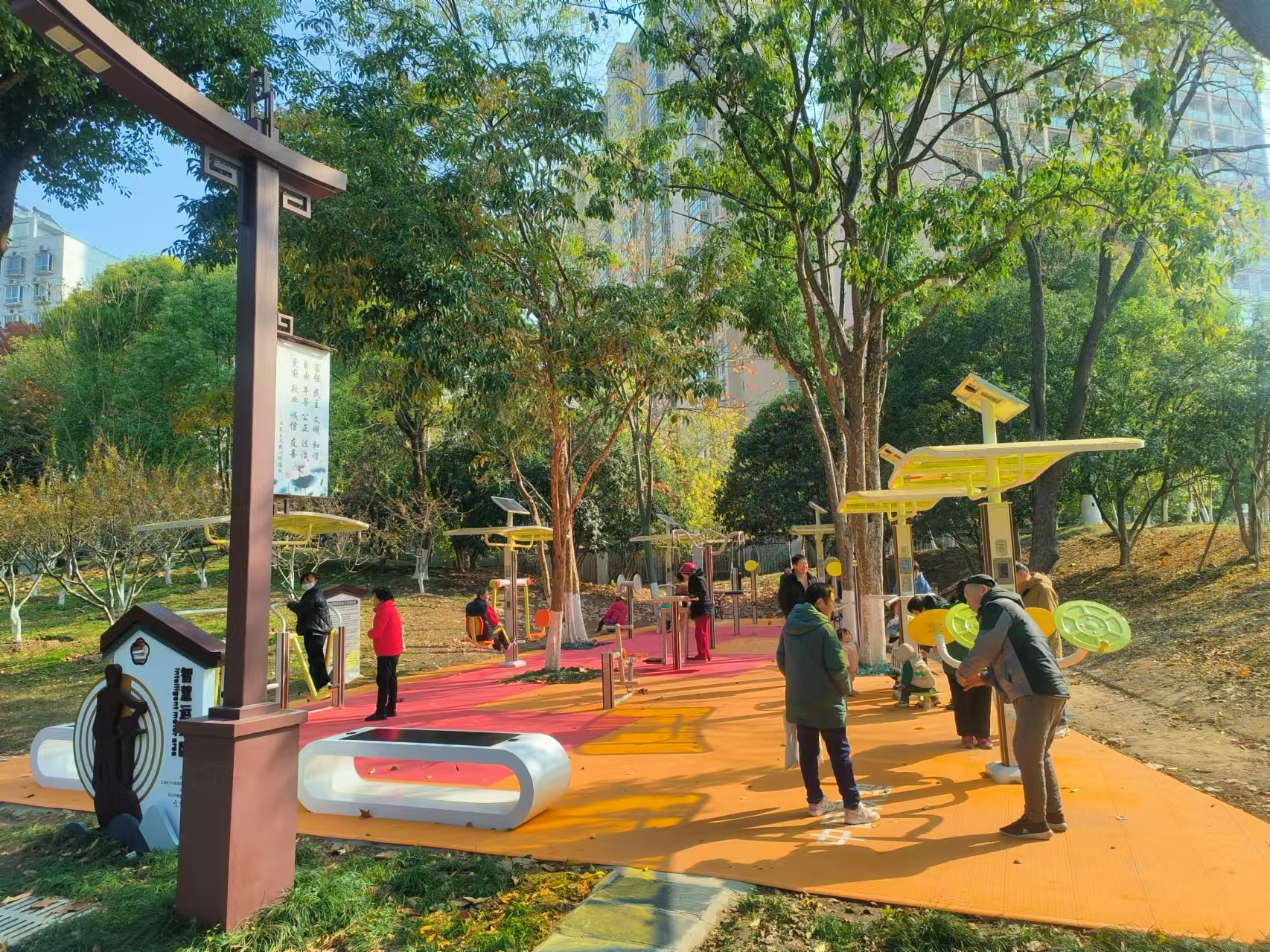 公园占地面积约为11000平方米,含室外健身广场、乒乓球、棋牌、智慧健身路径、篮球场、少儿无动力等设施,可同时开展10项以上体育运动项目。