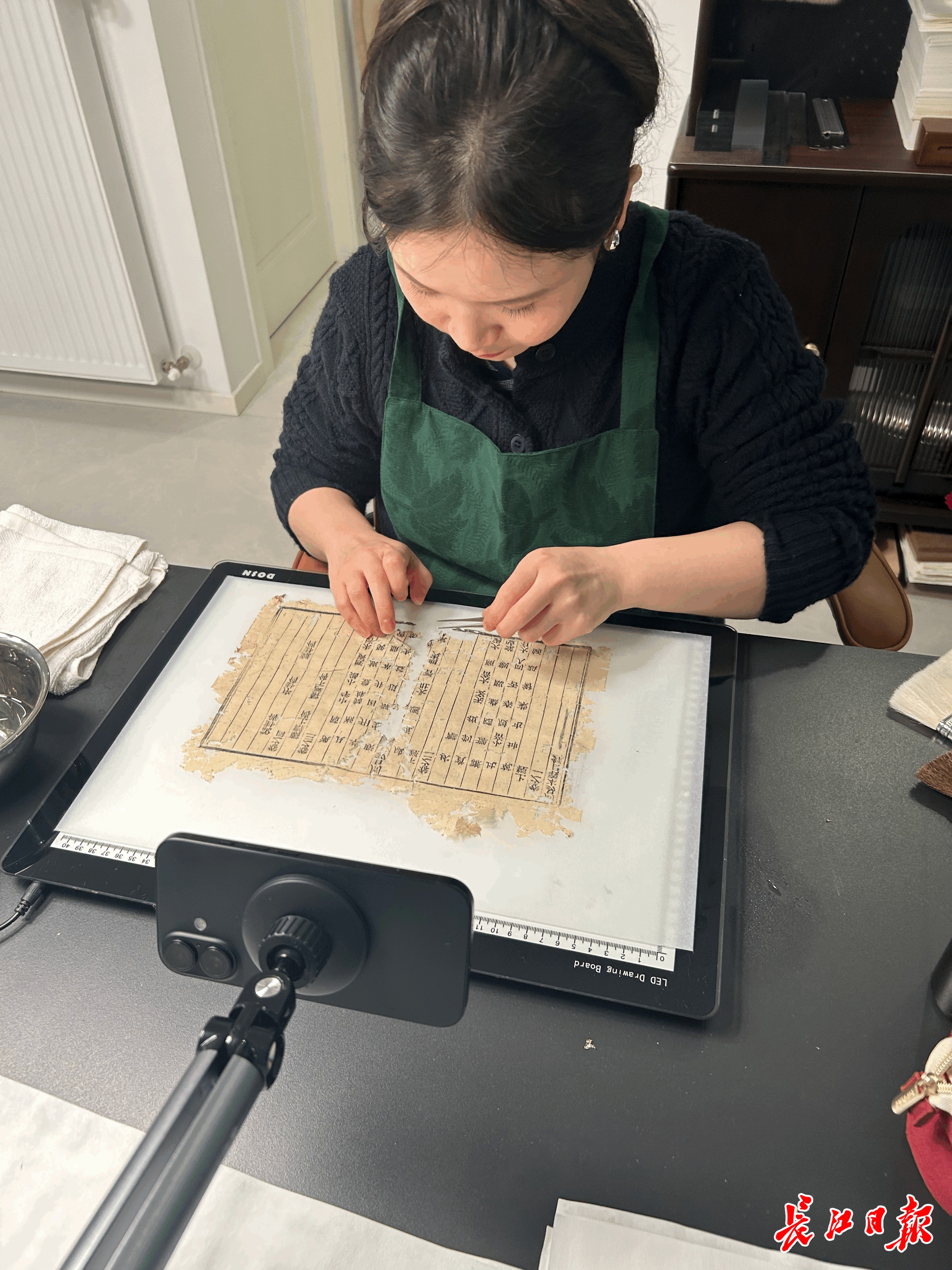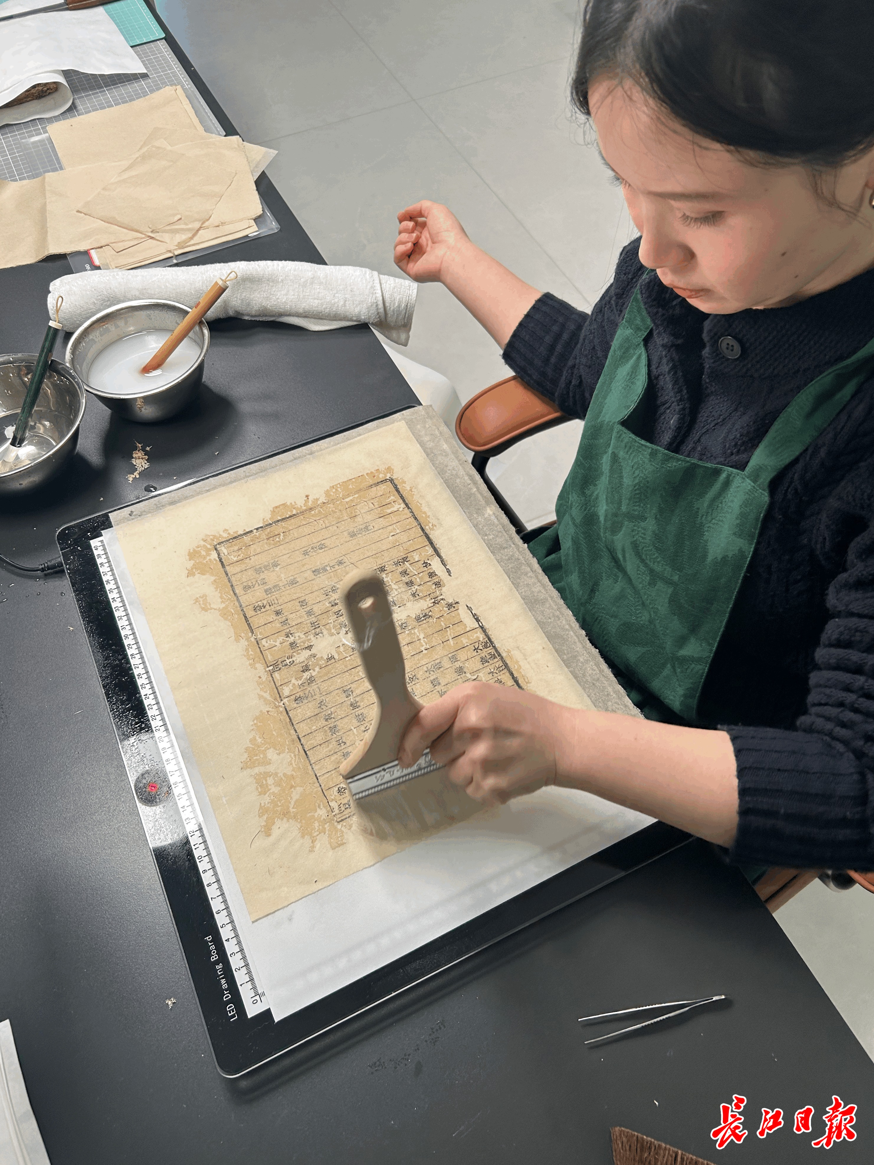 “有时古籍破损太严重,光是第一步‘展平书叶’就要几个小时,注意力得保持高度集中,避免失误导致古籍受损。”她分享,曾有同事因稍不注意,下手过重将书叶戳得皱在一起,为了恢复原状花了一天时间。所以感到烦躁时,李洋洋会停下手里的工作,干点别的,等心情平复后再继续。
