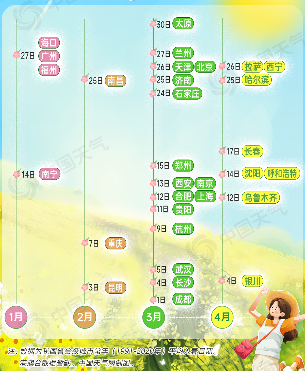 武汉常年入春时间为3月5日,在全国直辖市、省会城市中处于第三梯队,其中第一梯队南宁、海口、广州、福州入春时间均在1月份,南宁1月14日入春,在这些城市中排名第一;昆明、重庆、南昌常年入春时间均在2月,位列入春时间第二梯队;武汉、成都、杭州、郑州等城市则集中在3月上旬和3月下旬入春;哈尔滨、沈阳、长春、西宁、拉萨等城市则常年在4月入春。