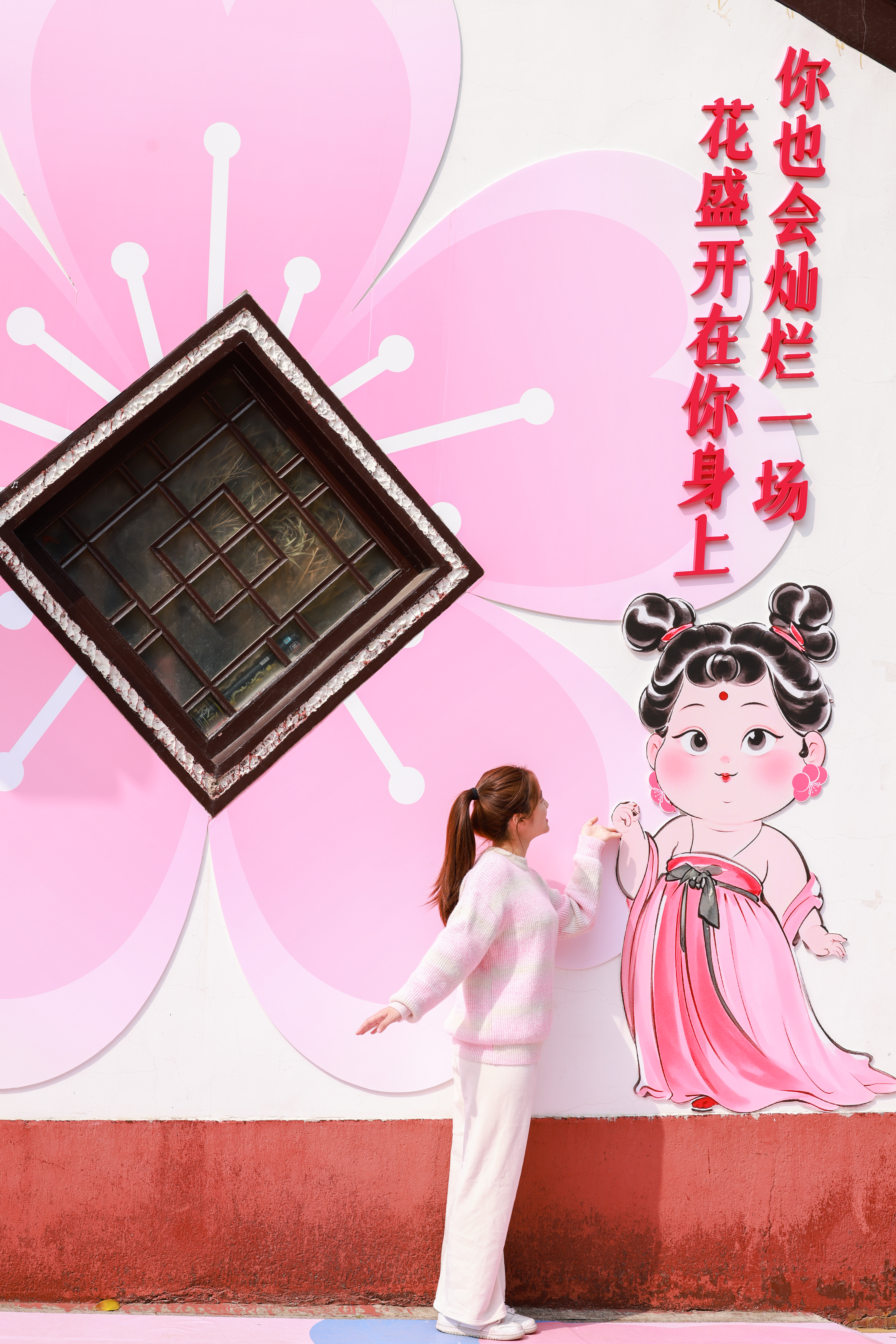 在这里遇见武汉最大的樱花。在楚才韬奋书院木栈道平台处,“长”出一朵巨大的樱花,粉嫩的色彩增添浪漫气息。一旁的樱花主题打卡点处,今年爆火的《哪吒2》人气角色“石矶娘娘”换上樱花主题的粉色新装,成为春日“顶流”,吸引无数市民游客前来打卡。