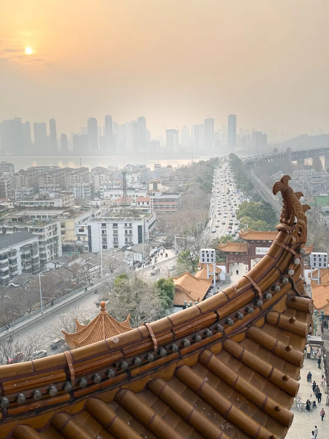 我不禁回想起上一次登黄鹤楼还是在2016年,时隔多年,这次来看,觉得“城市长高了”,江对岸的建筑拔地而起越来越高、城市越来越美,游玩黄鹤楼的方式也产生了变化。从高处俯瞰,甚至能看到非常有名的黄鹤楼“红墙”,那一刻,我真想向他们挥挥手,真应了那句“你站在桥上看风景,看风景人在楼上看你”。