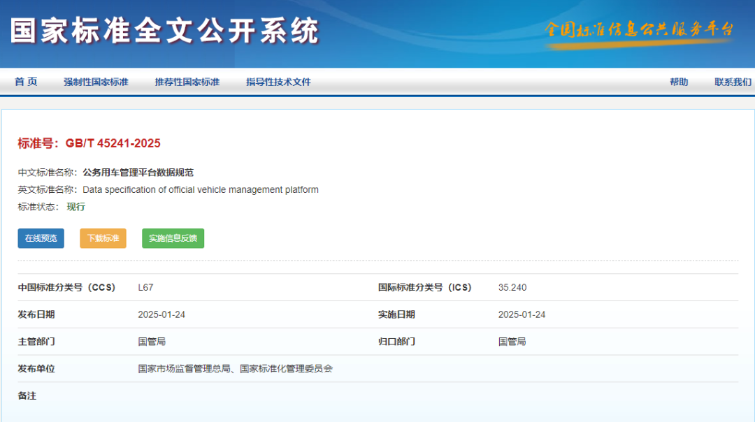 近期,市场监管总局(国家标准委)批准发布《公务用车管理平台数据规范》国家标准(GB/T 45241—2025),该标准是我国公务用车管理领域首个国家标准。