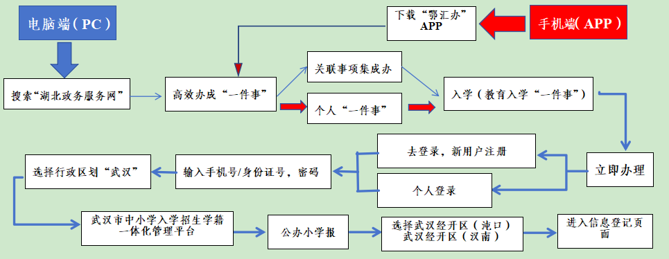 ※ 所有符合本区入学条件的学生,在进入“武汉市中小学入学招生学籍一体化管理平台”后均需选择“公办小学入学”。民办小学报名必须先进行公办小学报名,完成信息登记且审核通过后,才具备民办小学报名资格。