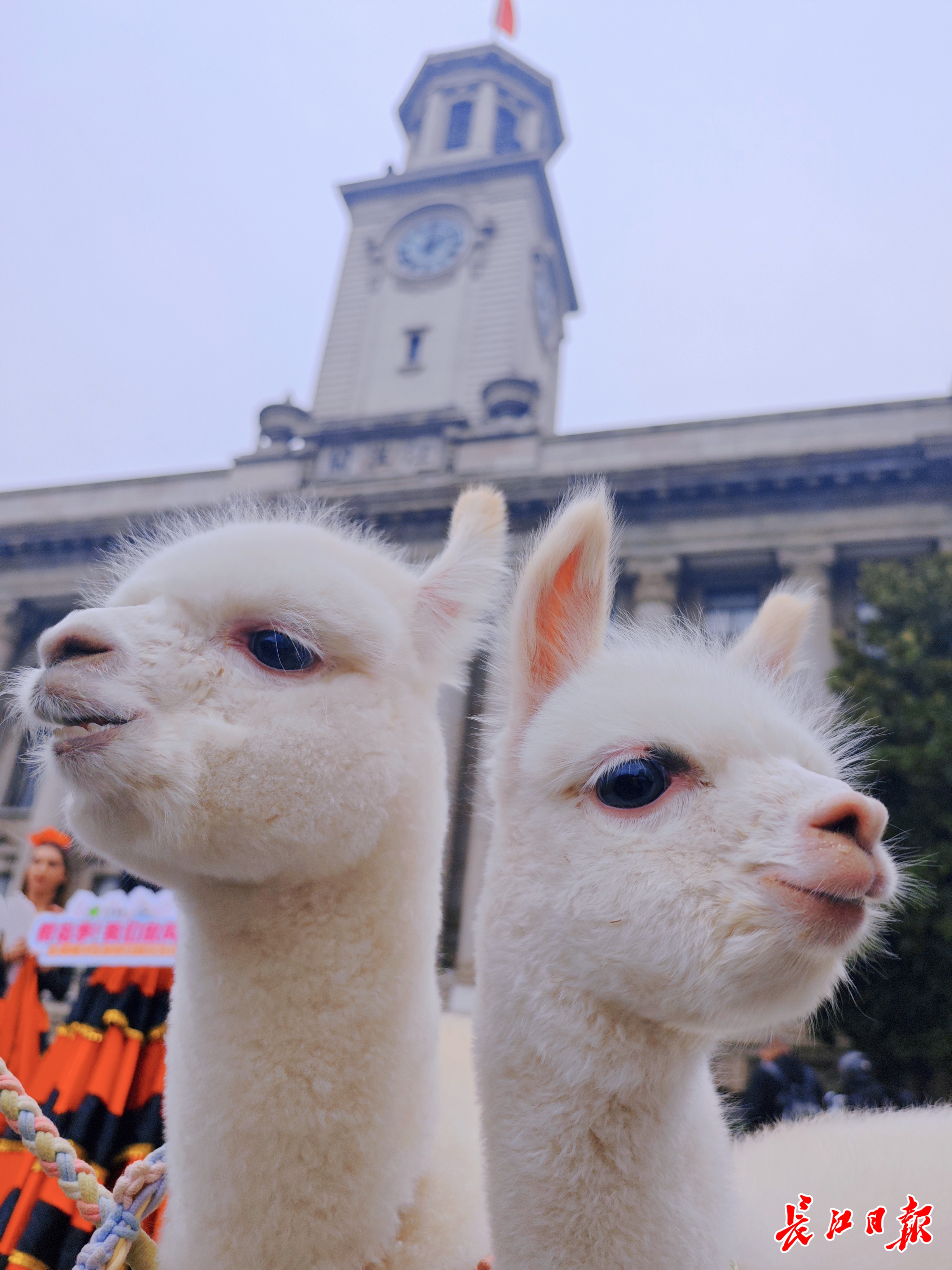 来自东湖海洋乐园的羊驼“多多”和“乐乐”打卡江汉关博物馆。记者何晓刚 摄