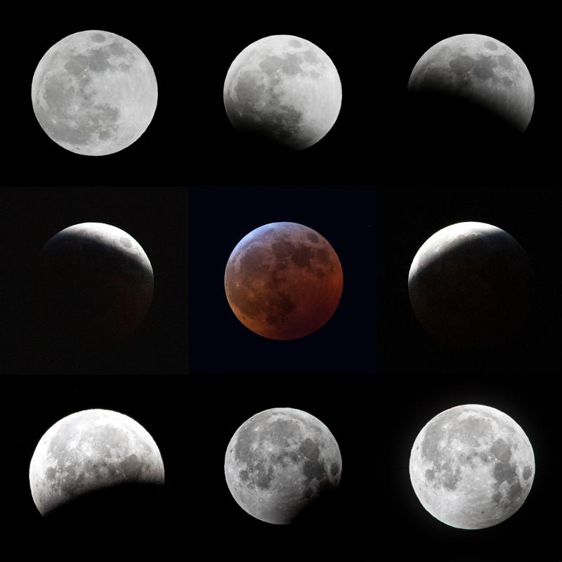 2019年1月20日至21日在美国纽约拍摄的月全食过程(拼版照片)。(王迎 摄)