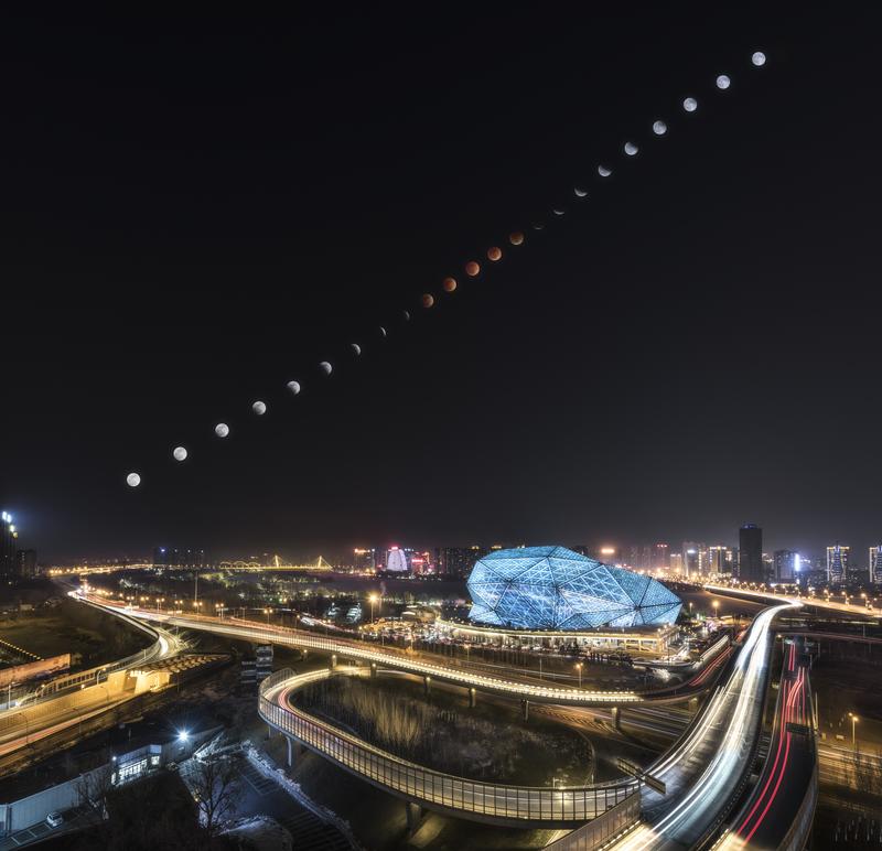 2018年1月31日在沈阳盛京大剧院拍摄的月全食过程(拼版照片)。(孙建鑫 摄)