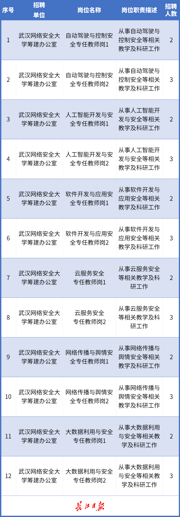 武汉信息网络学院(武汉网络安全大学,暂定名)2025年专任教师专项招聘岗位一览表▼