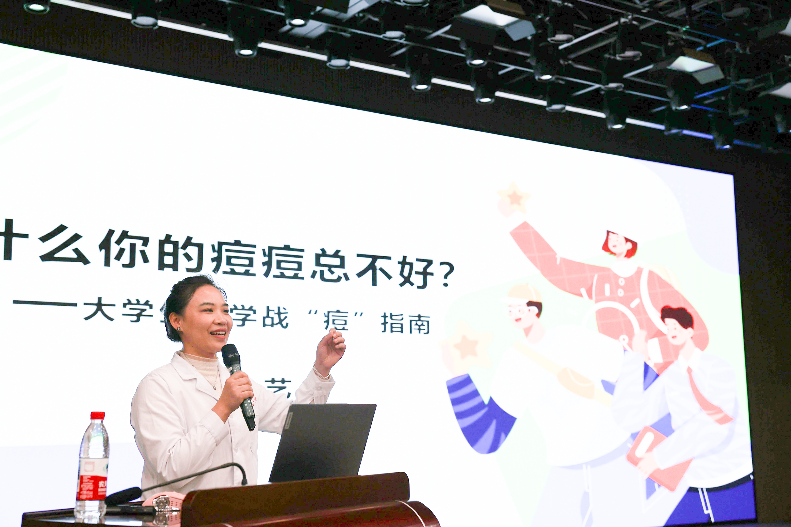 为什么你的痘痘总不好?胡艺带来了《大学生科学战“痘”指南》,围绕“痤疮是什么”“痤疮产生的原因”“预防、治疗及护理原则”等方面进行详细讲解,让同学们对痤疮有了更科学深入的了解。她希望同学们以科学知识为武器,告别盲目祛痘误区,养成健康的生活习惯。