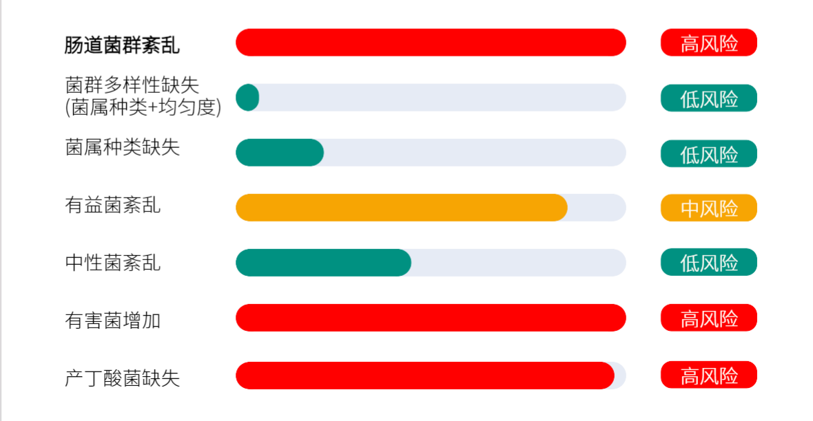 经肠道微生态检测,结果令人震惊:马先生的肠道菌群紊乱处于高风险状态,表现为有益菌大量缺失、有害菌增加以及产丁酸菌缺失。安萍教授介绍,有害菌的增多促使肠道内炎症因子与毒素产生,引发腹泻等症状;产丁酸菌缺失则破坏肠道黏液层,造成肠漏,使毒素直接进入血液。