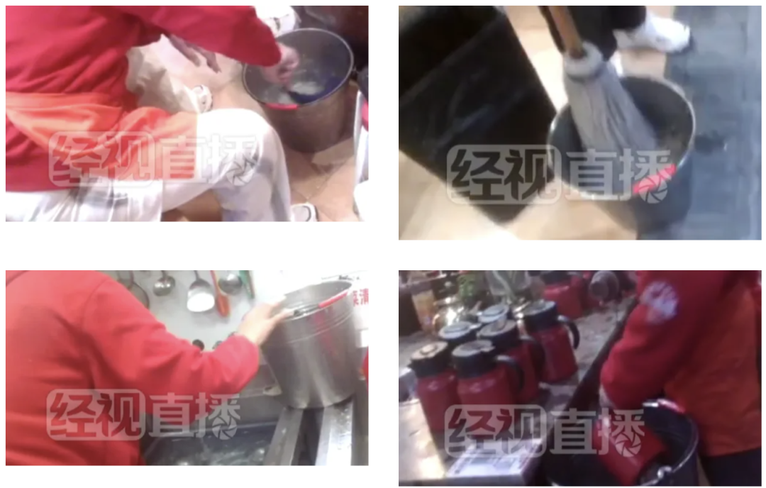 除此之外,记者观察发现,这家店无论是洗拖把、抹布、倒食物残渣、洗茶桶、还是存放餐具,用的都是放在洗手间门口的五六个铁桶,而这些桶的桶身并没有任何明显的标记来区分其用途。