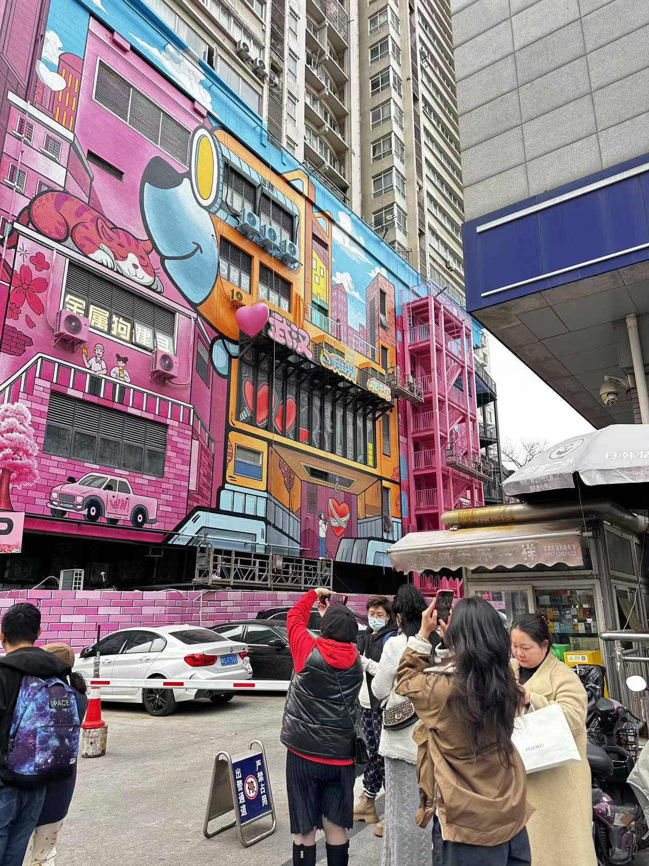 “这是属于街道口的独特樱花,我很喜欢这幅画的颜色和形式,画中的小猫小狗也很可爱,非常治愈。”就读于华中师范大学新闻传播学院的赵同学特意来墙绘前打卡拍照,“初春的街道口因为这幅画都变得生动明媚了许多”。