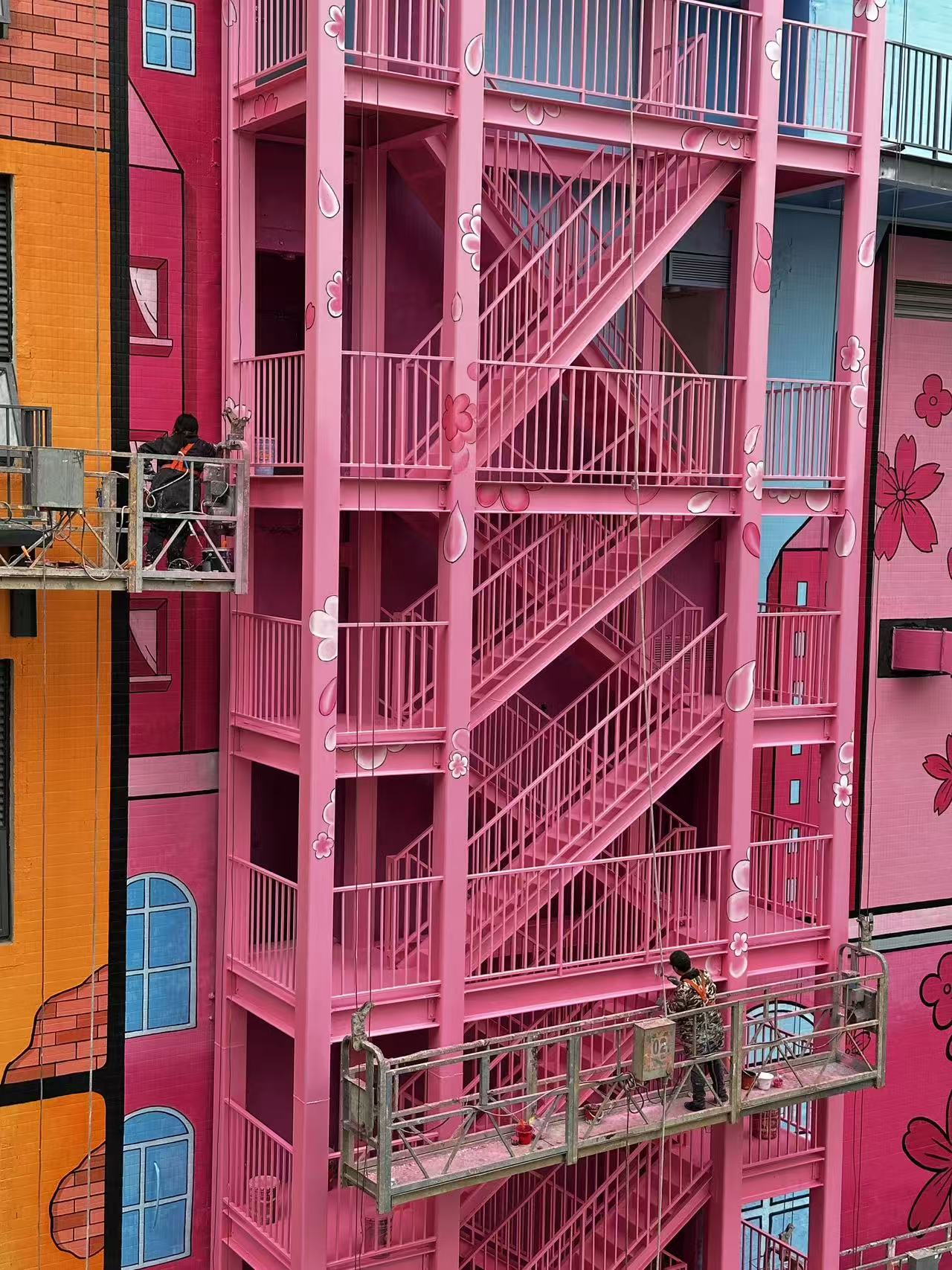 据悉,墙绘在创作期间,很多市民还通过社交媒体用“云监工”的形式参与绘画,提出了不少意见。“为了整体的和谐,我们在绘画过程中调整了20多处细节。在大家的建议下,我们为墙体增补了灯光,还把低层的围墙绘成了整齐的粉色砖墙模样。”张浩说。