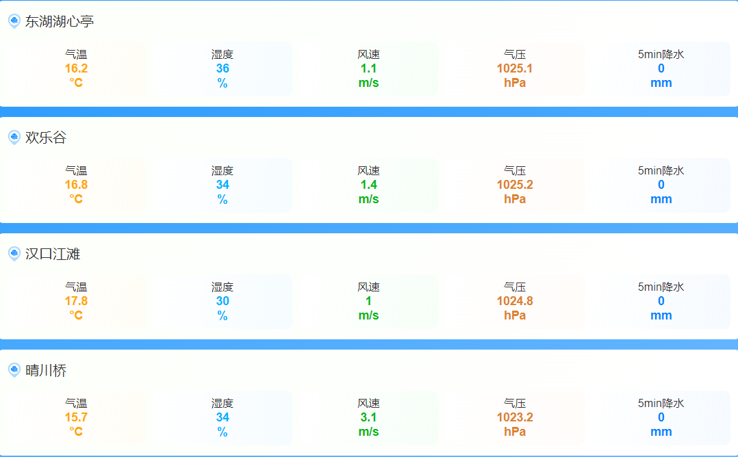 各大站点的气温、湿度、风速、气压、降水情况一目了然。