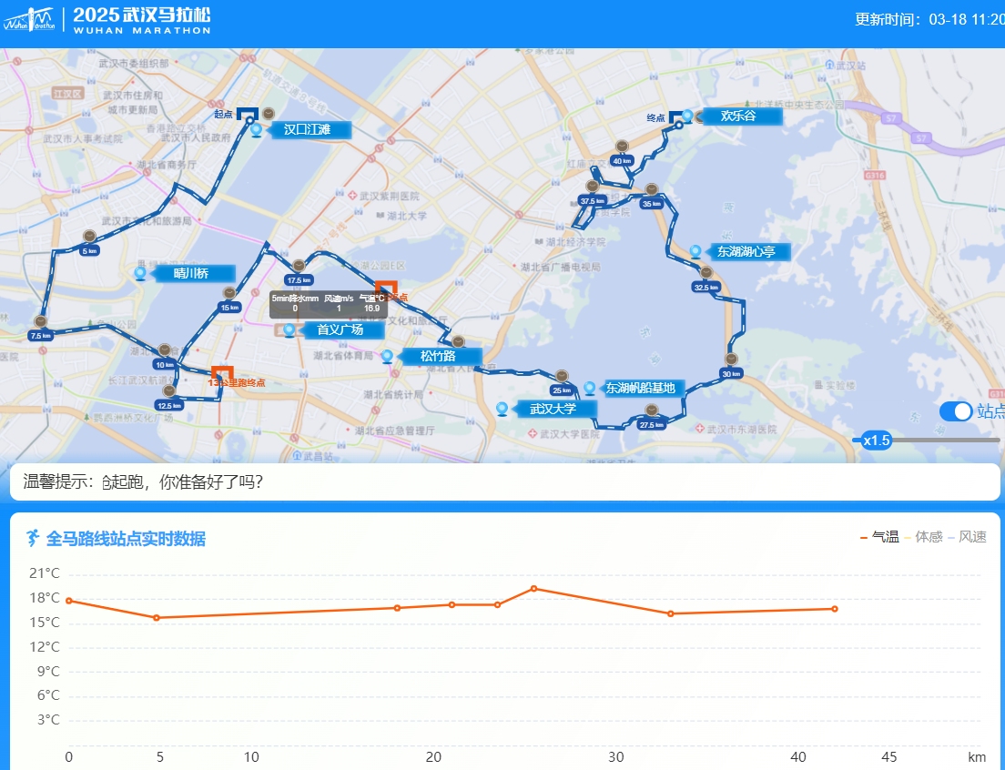 通过武汉马拉松天气地图,可以实时查询沿线站点气象信息。