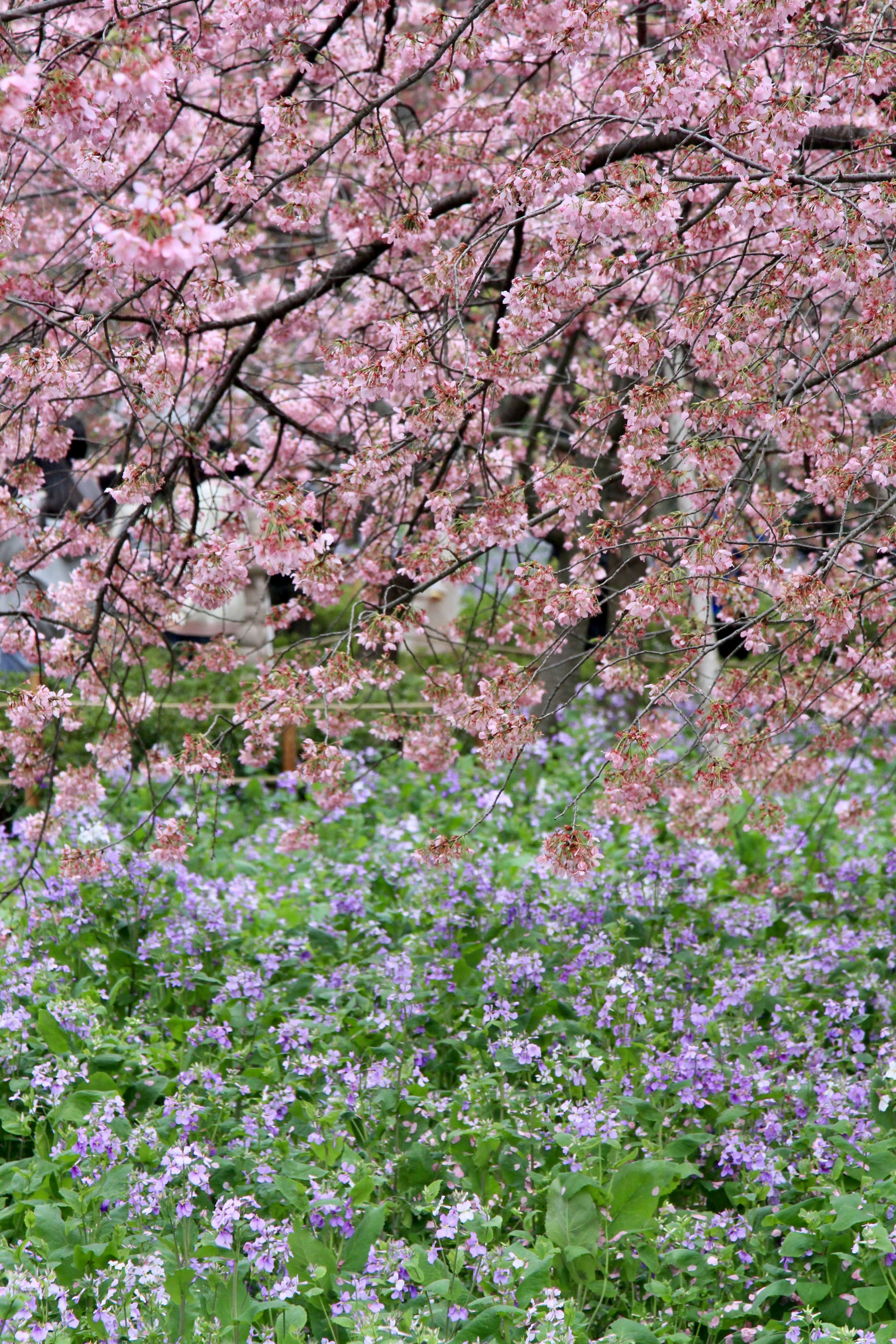 东湖樱花园樱花树下,二月兰正在绽放。赵丽摄