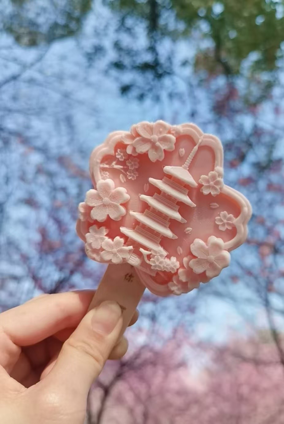 雪糕上,圈圈樱花簇拥着东湖樱园的五重塔,通体樱花粉的立体雕刻造型,十分吸睛。在五重塔下举着雪糕拍一张同角度照片发朋友圈,能迅速收获不少点赞。