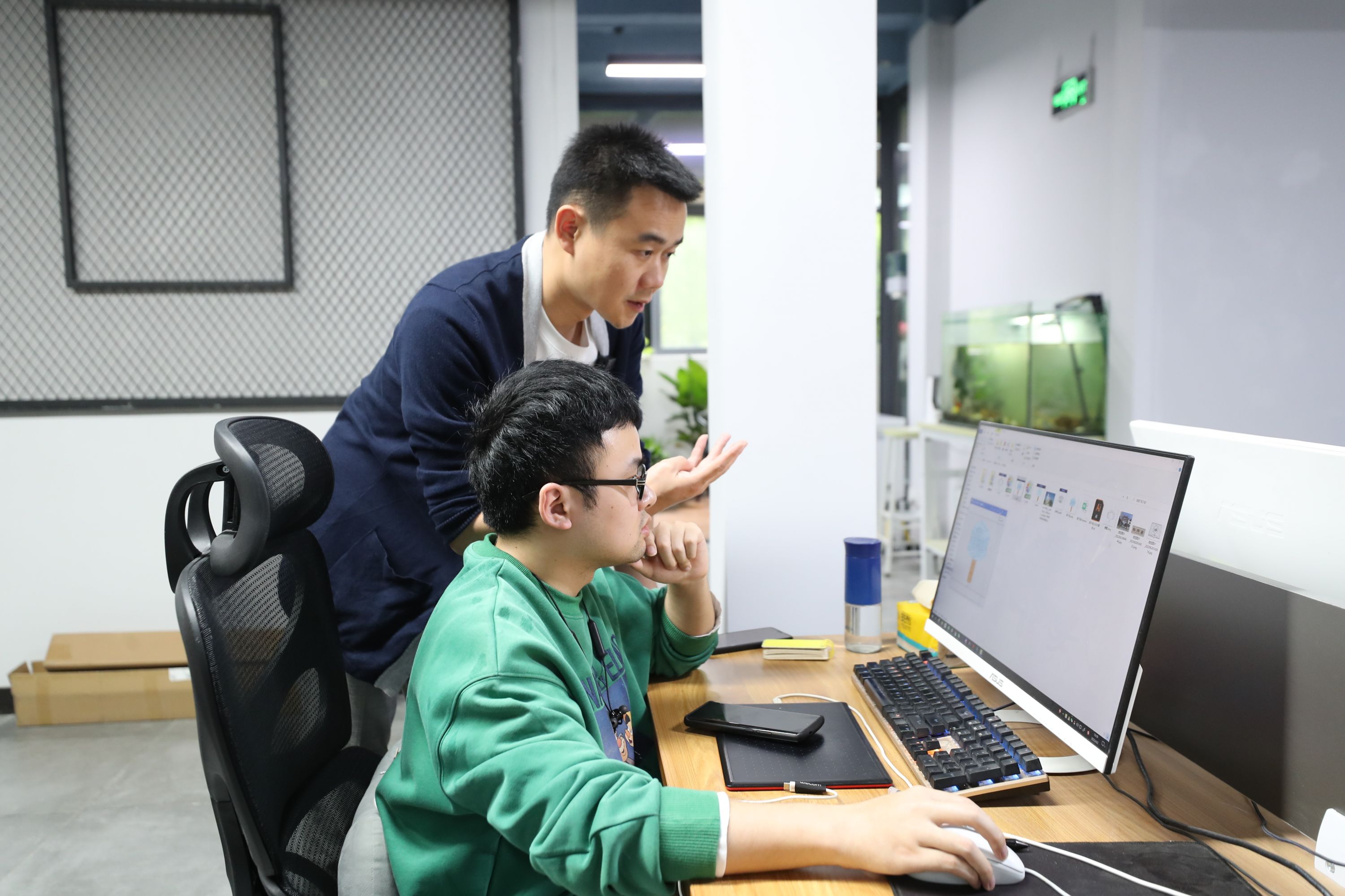 史召(左)和设计团队商量设计方案。
