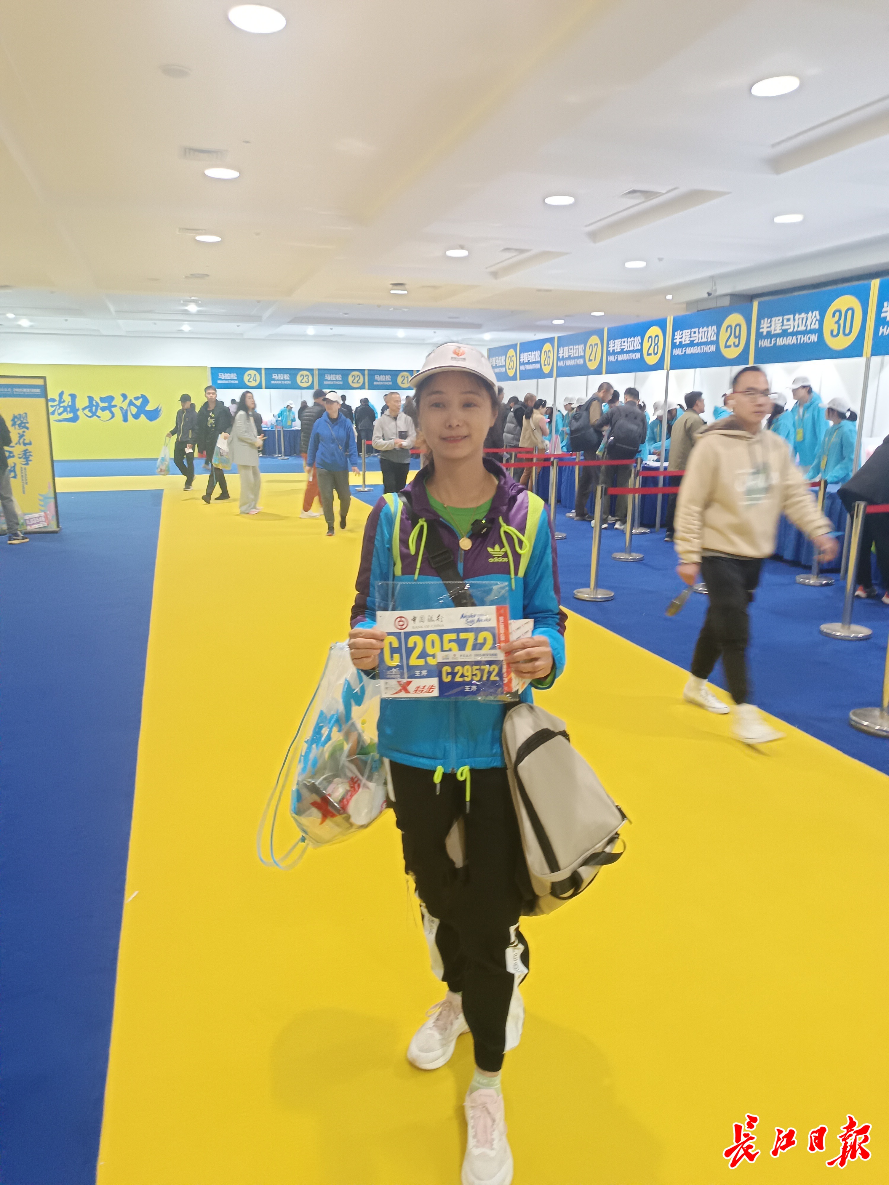 3月20日,武汉正式进入“汉马”时间。9时30分,中国银行2025年武汉马拉松开始领取参赛物品,来自武汉的C29572号选手王芹成为全场第一个拿到号码布的选手。巧合的是,去年汉马,王芹也是第一个。