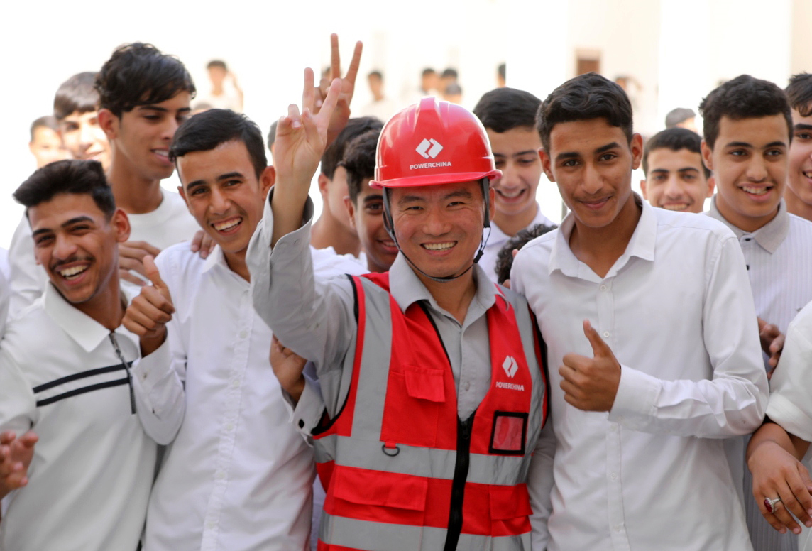 在新建成的穆萨纳省胡达尔高级中学,当地学生与中国建设者亲切合影。