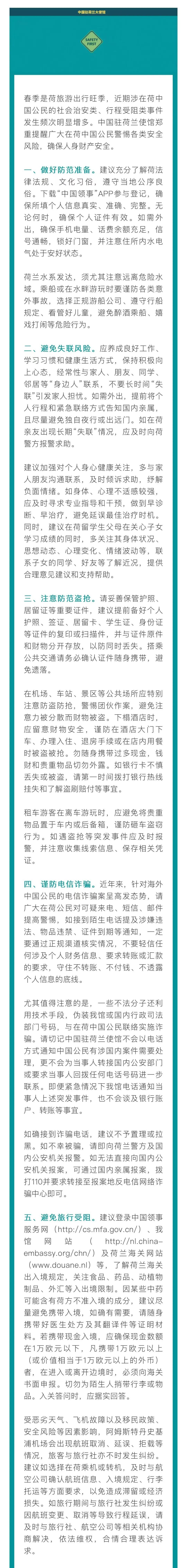 3月20日,中国驻荷兰王国大使馆发文,提醒在荷中国公民注意防范各类安全风险,如盗抢、电信诈骗等,确保人身财产安全。